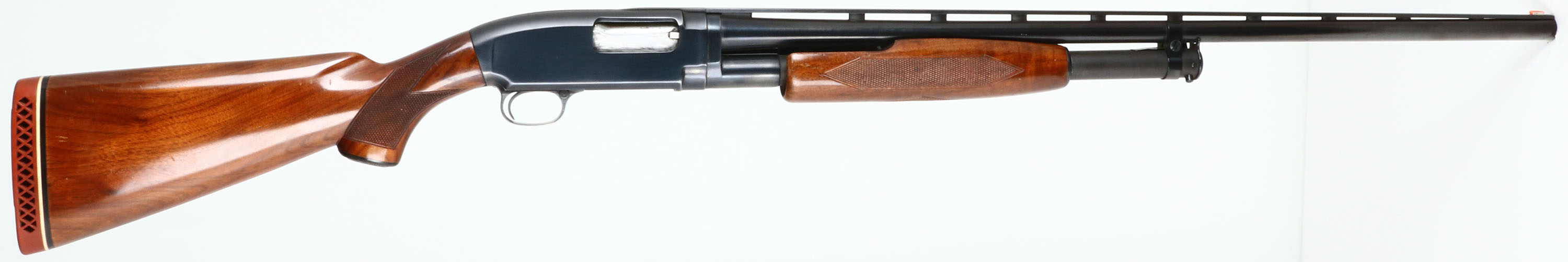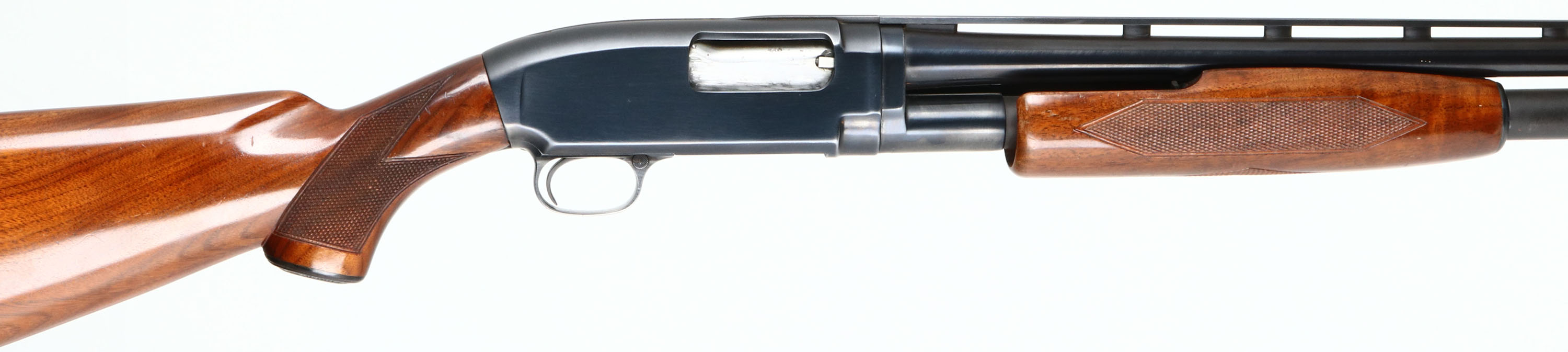 Winchester, Model 12 Deluxe, CAL: 20 GA, MFG: 1943, SN: 1656964, Pump Action Shotgun, Choke: MOD, 2 3/4'', 28'' Ventilated rib barrel. The deluxe checkered & capped pistol grip wood stocks are excellent, with nice flowing grain, particularly on the left side of the stock. There are a couple of small dings & scrapes to the original finish. The original metal blue finish rates 95% on the barrel, 90% on the receiver. Bore is excellent. Single front red fiber optic rod. Buttstock carries a ventilated Winchester recoil pad. 13 5/8'' LOP over pad. A very nice deluxe Winchester model 12. FFL or C&R Req. - Value: 800 to 1200