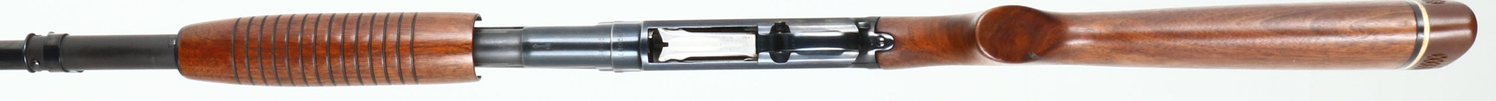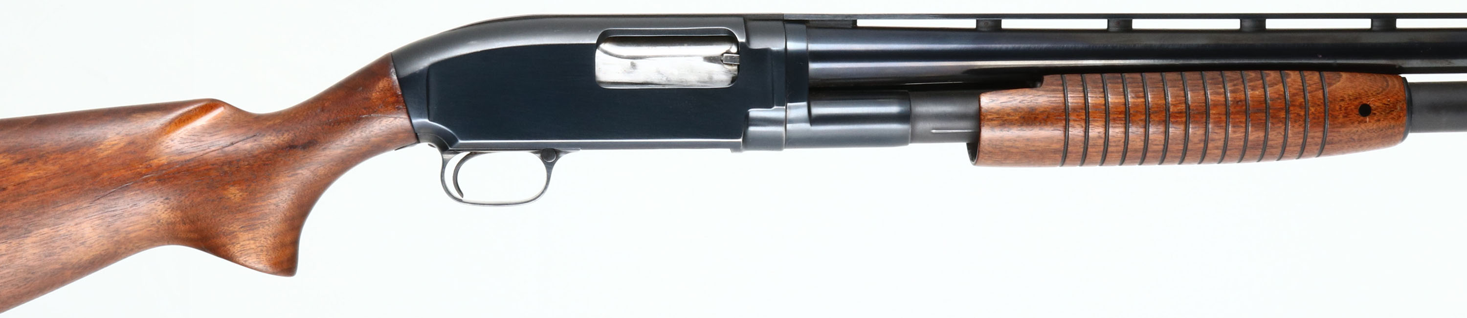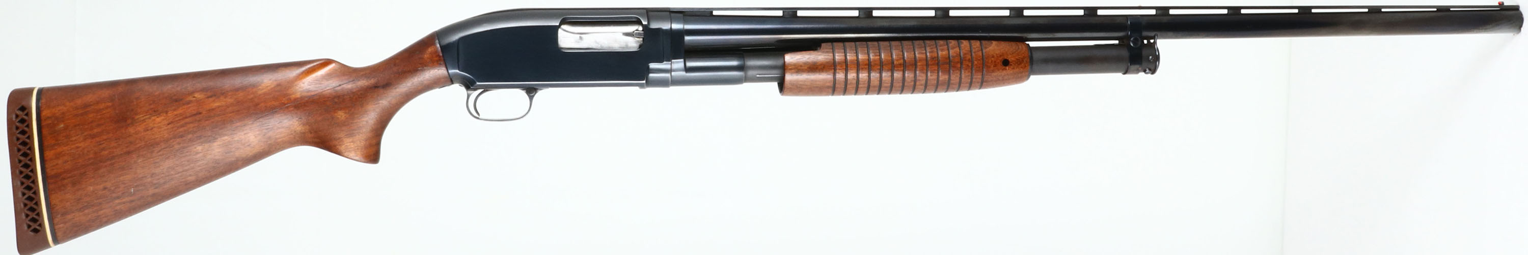 Winchester, Model 12, CAL: 12 GA, MFG: 1955, SN: 1640589, Pump Action Shotgun, Choke: Full, 3'' Chamber, 30'' Ventilated Rib Barrel. The original flat pistol grip wood stock & long corncob forend are excellent, having been lightly sanded & reoiled. There are a few minor contusions remaining. The top of the comb has two round black plastic inlay, while the forend has a the same black inlay on the right & a white inlay on the left. These inlays are nicely done. The restored metal blue finish on the barrel rates 98%, while the receiver appears to retain 95% of the original factory blue on the sides & the matte gray finish on the top. Bore is excellent. Barrel carries a partial white mid bead & a red front bead. Buttstock carries a ventilated Pachmayr White-line recoil pad. LOP: 13 7/8'' overpad. FFL or C&R Req. - Value: 350 to 700