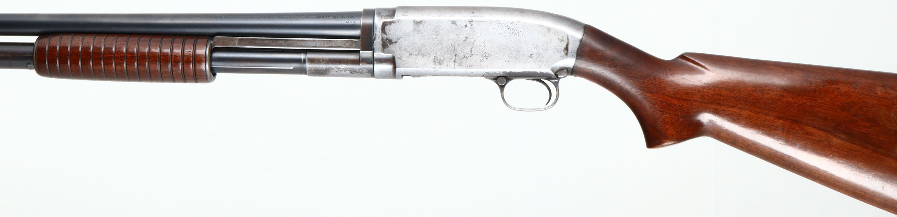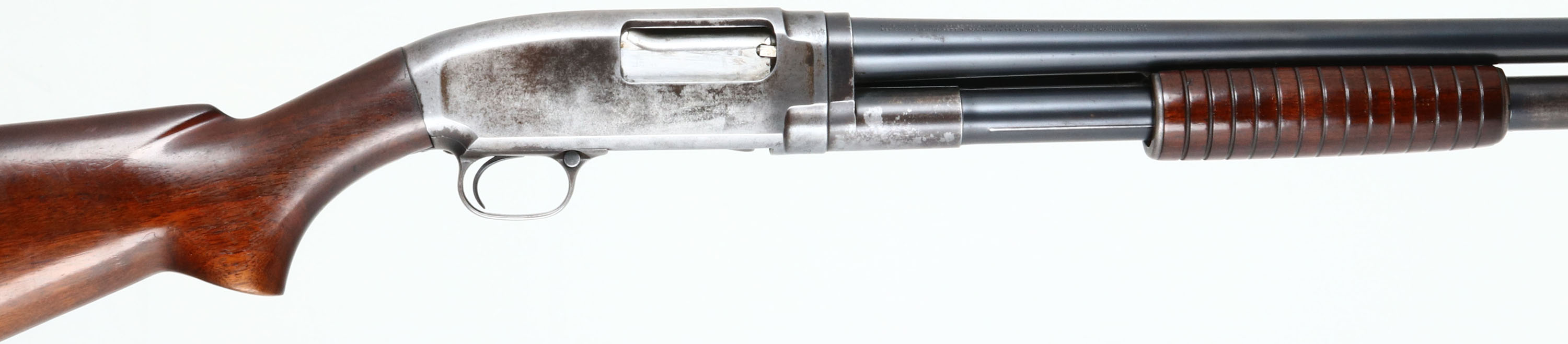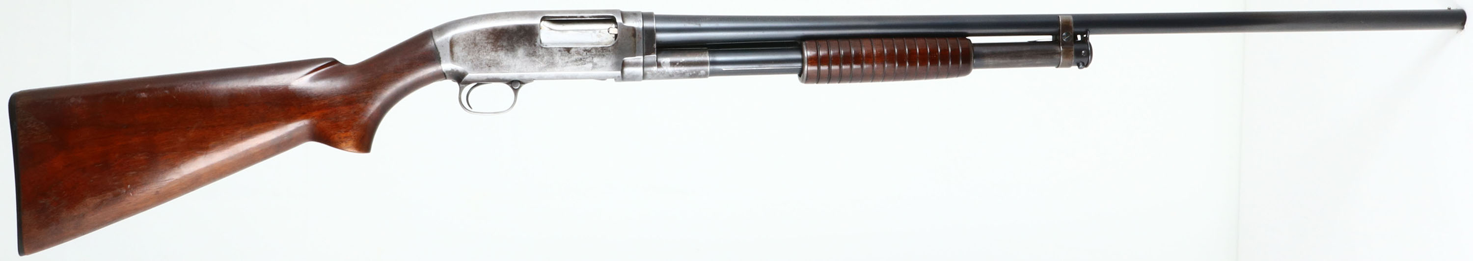 Winchester, Model 12, CAL: 16 GA, MFG: 1938, SN: 790474, Pump Action Shotgun, Choke: MOD, 30'' Barrel. The original flat pistol grip wood stock & short corncob forend are excellent, displaying small contusions, scratches & scrapes to the original finish, which has some thinning. The original metal blue finish rates 90% on barrel & 70% on mag, while the receiver worn gun metal gray, with a thin bit of brown patina. Bore is excellent. Single front bead. Buttstock carries a Winchester buttplate. LOP 14''. FFL or C&R Req. - Value: 250 to 500