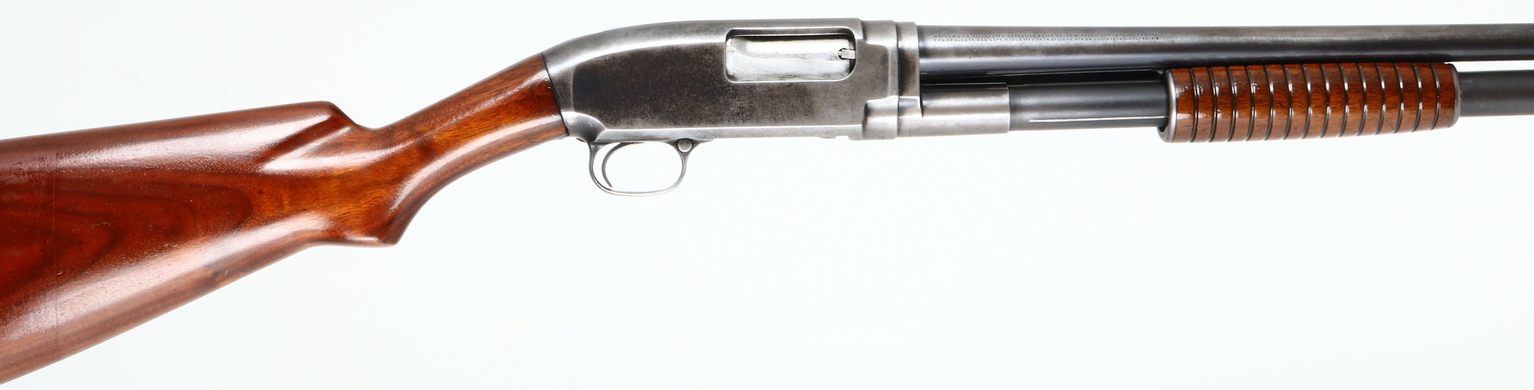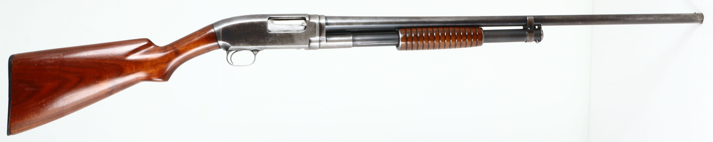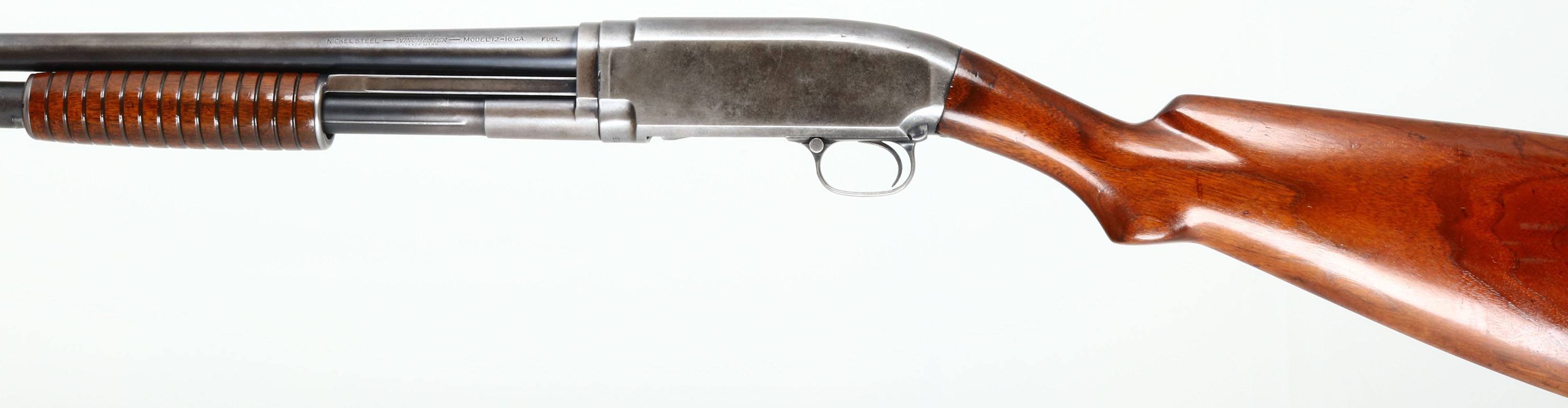 Winchester, Model 12, CAL: 16 GA, MFG: 1927, SN: 502575, Pump Action Shotgun, Choke: Full, 28''. The original flat pistol grip wood stock & short corncob forend are very good, having been sanded & refinished, small handling marks & scrapes remain. The metal & finish have worn away to a gun metal gray. With some remnants of blue remaining. Bore is excellent. Single front bead. Buttstock carries a Winchester buttplate. LOP 13 1/2''. FFL or C&R Req. - Value: 200 to 400