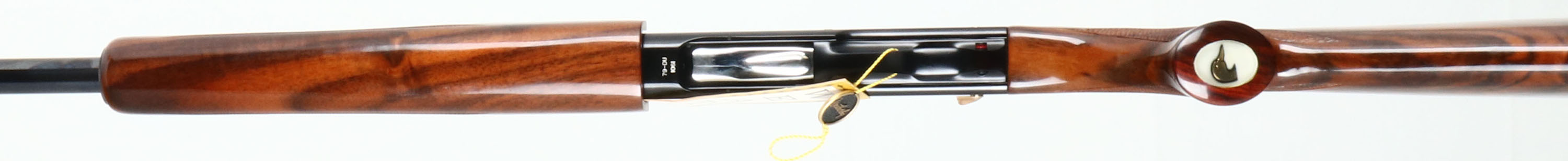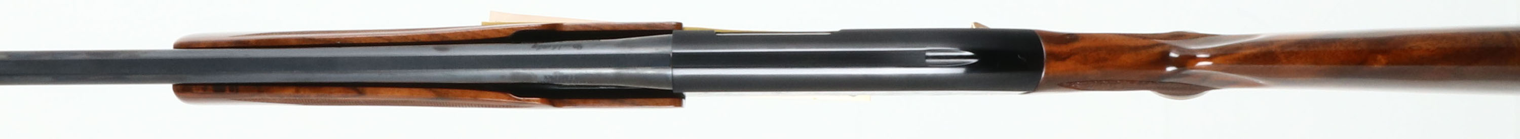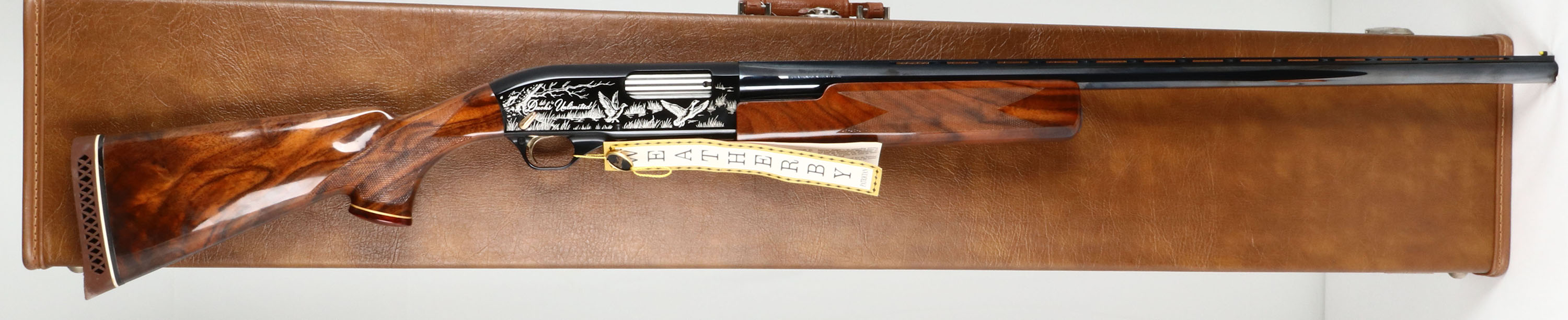 CASED Weatherby Model ''Patrician II'', CAL: 12 GA, MFG: 1976-81, SN: 79-DU1061, Pump Action Shotgun, Choke: F, 29'' Ventilated rib barrel. The Patrician II replaced the original Patrician model & in 1979 they collaborated with Ducks Unlimited to produce a limited number of guns. This is one of those special addition shotguns. The original checkered & capped pistol grip wood stocks are excellent, exhibiting fantastic wood grain. The pistol grip cap has an encased gold tone DU duck's head. There are virtually no defects. The metal blue finish rates 99% overall on the barrel & receiver. The receiver displays laser engravings of multiple ducks, the DU shield & the words ''Ducks Unlimited'' & ''Weatherby Patrician II''. Bore is Mint. Gold trigger. The ventilated rib holds a mid & front bead. Buttstock carries a Weatherby, ventilated recoil pad. Comes with the original hanging tag & instruction manual, in the original DU case, which also has its original hanging tag & key. LOP: 14 1/8'' overpad. FFL Req. - Value: 600 to 1200