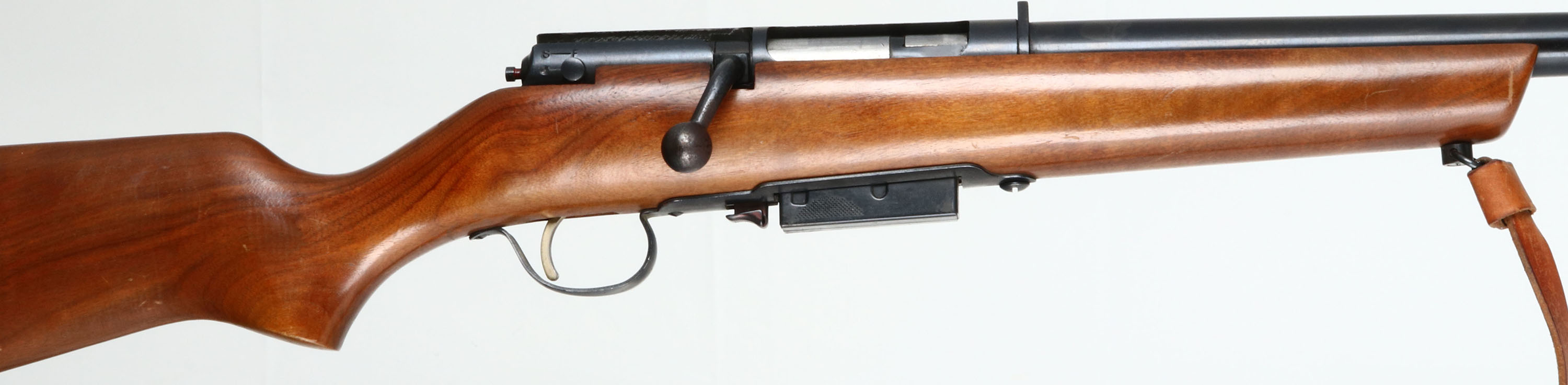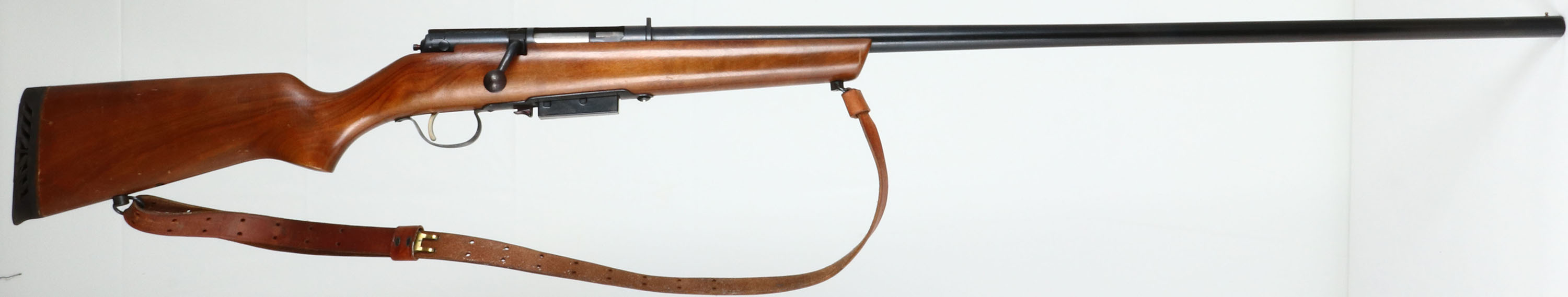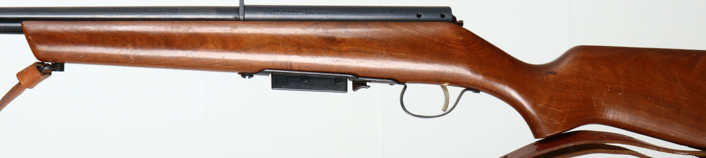 Marlin, Model 55 '' The Original Marlin Goose Gun'', CAL: 12 GA, MFG: 1954-64, SN: 25709264, Bolt Action Shotgun, RARE 36'' barrel. The original flat pistol grip stock is excellent. There are scrapes & scratches to the original finish. There is an open stud hole ahead of the current sling stud. The metal blue finish on the barrel rates 97%, with some light rust speckling & one small areas of pitting on the underside. The receiver rates 98%, with numerous small dings. The receiver is also tapped & drilled on the left side, with two open screw holes. Bore is excellent & bright. The barrel holds a single front bead. Stock carries a ventilated black rubber recoil pad. Sling loops & leather sling. Comes with extra mag. Gold tone trigger. A nice condition original Marlin Goose Gun. FFL or C&R Req. - Value: 500 to 1000