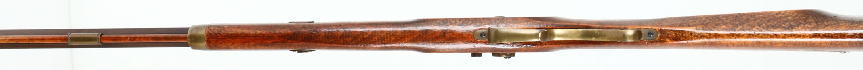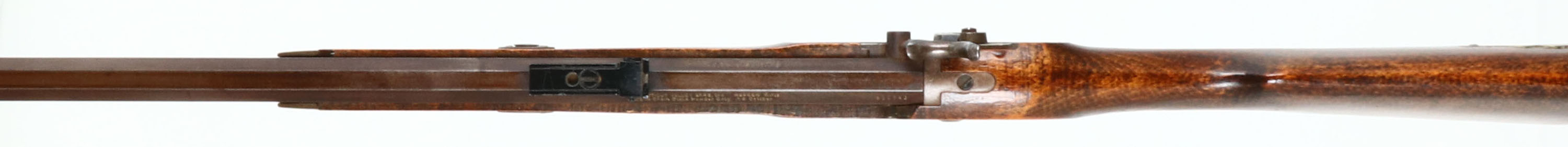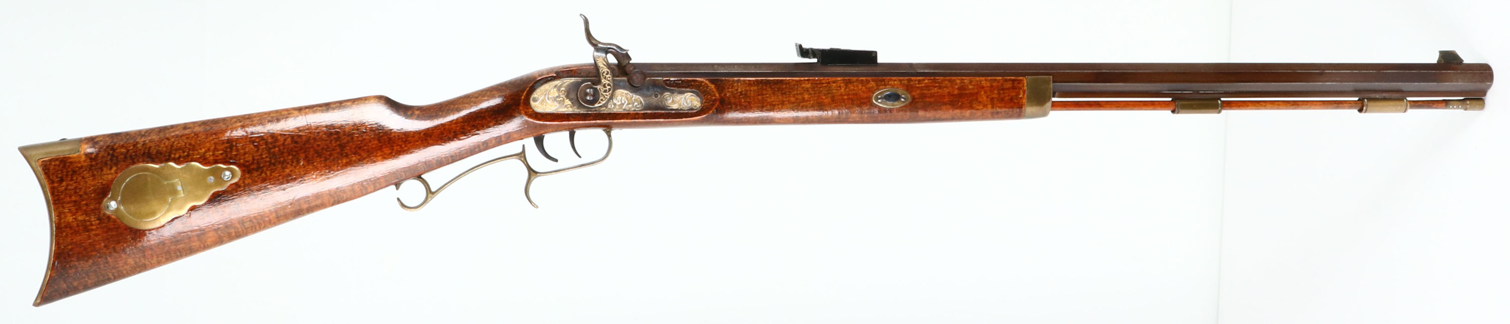 Connecticut Vally Arms Inc., Hawken Rifle, Cal: .54, MFG; Modern, S/N: 856943, Percussion Muzzleloader, 28'' octagon barrel. The cheeked, straight wrist wood stock is excellent with little to no wear, trapdoor compartment on right side of stock. The metal has toned to a even brown patina, lock plate has nice floral engravings. Left side of barrel is marked ''CONNECTICUT VALLEY ARMS, INC HAWKEN RIFLE'', ''MADE IN SPAIN BLACK POWDER ONLY .54 CALIBER'', S/N, right side of barrel has proof mark. Bore is good, bright with strong rifling, light roughness & pitting. Bead front sight with U-notch rear sight. Brass crescent mood buttplate, set trigger does not work. Muzzleloader, No FFL Req. - Value: 100 to 300