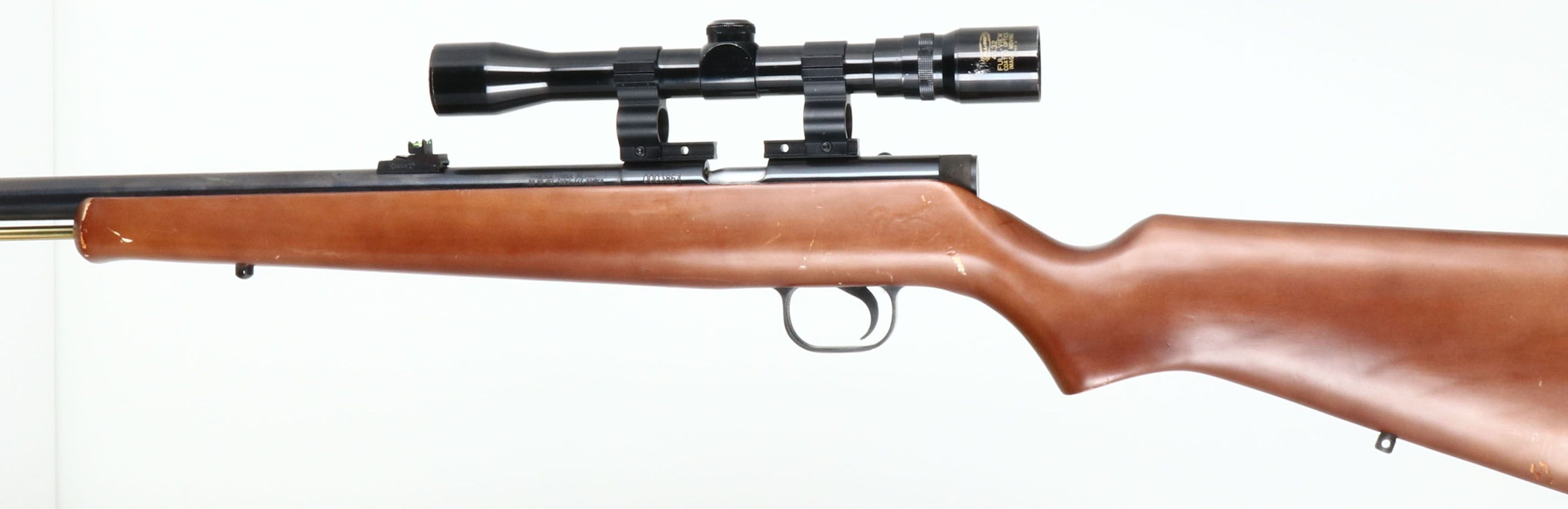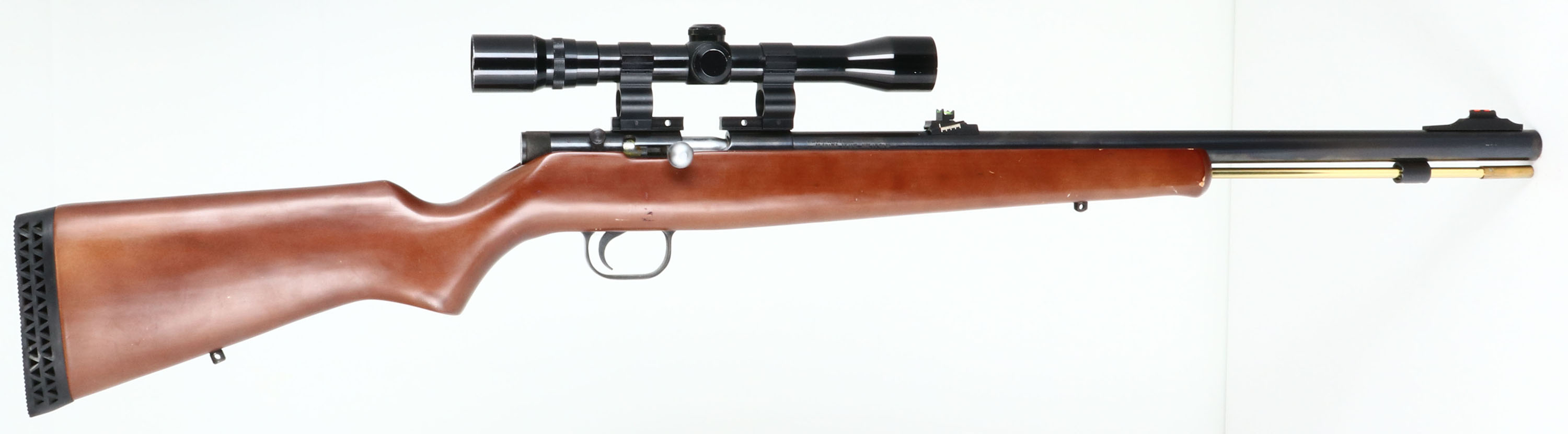 J. Sports, Legacy Model, CAL: 50, MFG: Modern, SN: 0003864, Bolt Action Rifle, 22 7/8'' barrel. The flat pistol grip wood stock is excellent, displaying minor nicks & dings to the finish. The metal blue finish on the barrel rates 99% overall. Bore is excellent & bright, with strong rifling. The receiver holds an All-Pro 4x32 Full View scope. The barrel holds an adjustable green fiber optic rear sight & red fiber optic blade front sight. Stock carries a ventilated black rubber recoil pad. Ram rod & sling studs are present. Comes with a camo cloth sling. Black Powder, No FFL Req. - Value: 100 to 300