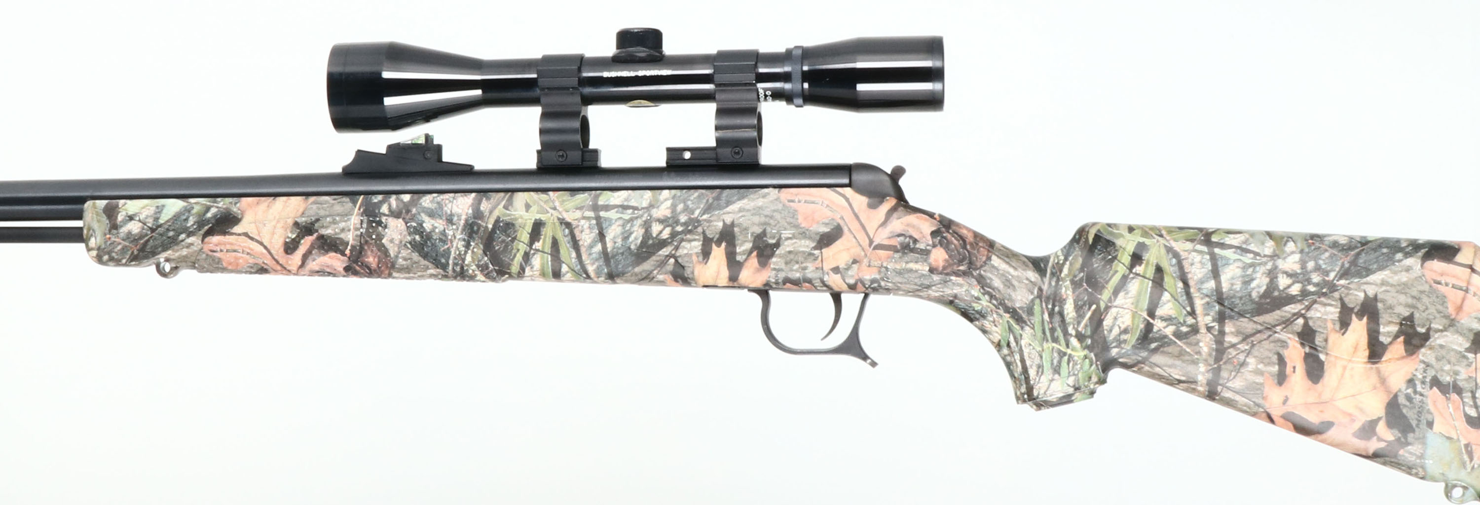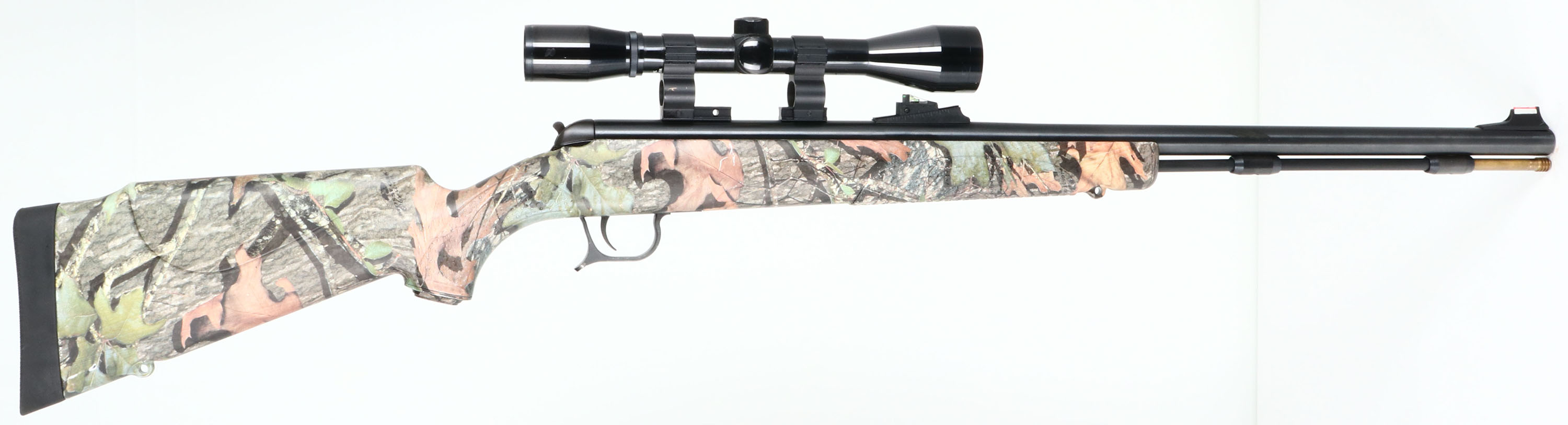 Connecticut Valley Arms, Kodiak Magnum, CAL: 45, MFG: N/A, SN: 61-13-065102-04, Break Rolling Breech Muzzleloader, 28'' barrel. The checkered, dual cheeked Monte Carlo style synthetic stock, with Mossy Oak Obsession camo pattern is excellent, displaying minor handling marks. The metal blue finish rates 95% overall, with scuffs & scrapes. Bore is excellent & bright, with crisp rifling. The receiver holds a Bushnell Sportview scope & the barrel holds an adjustable green fiber optic front sight & red fiber optic front sight. Integral sling privisions & ram rod present. A ready-to-go blackpowder rifle. Black Powder, No FFL Req. - Value: 100 to 300