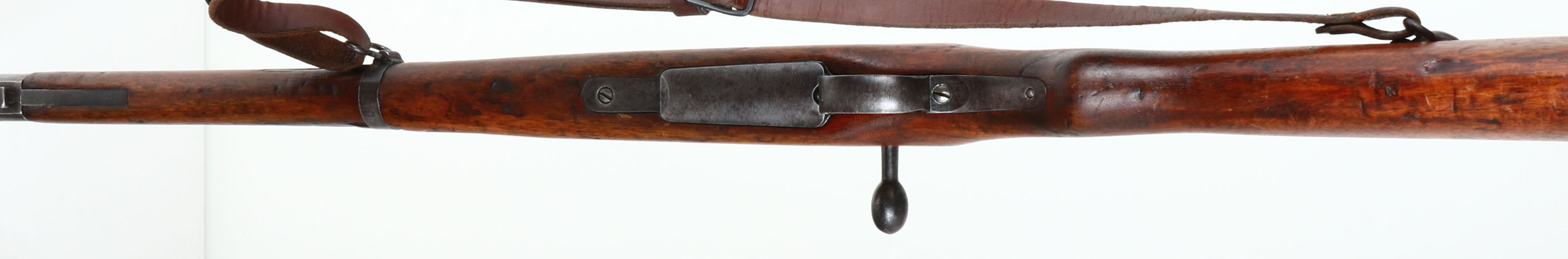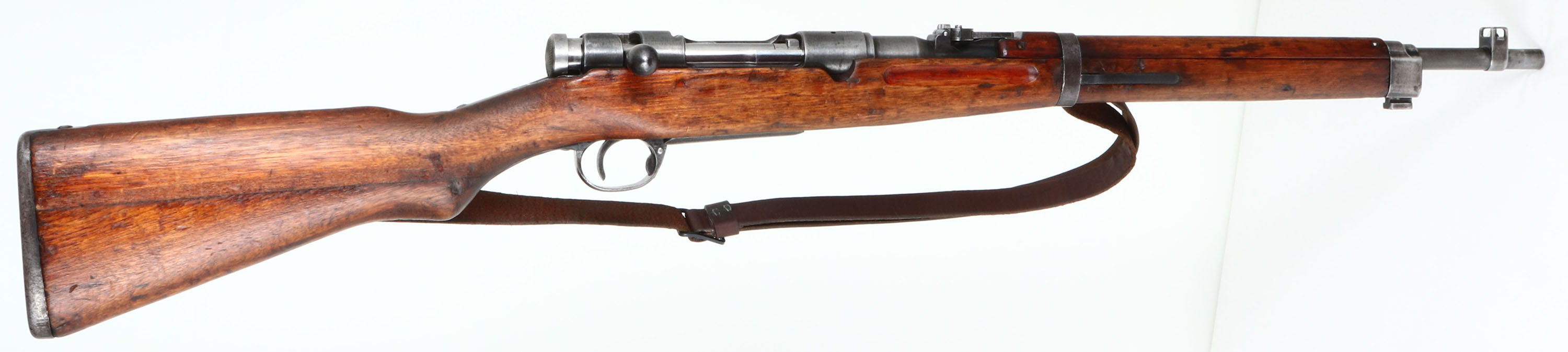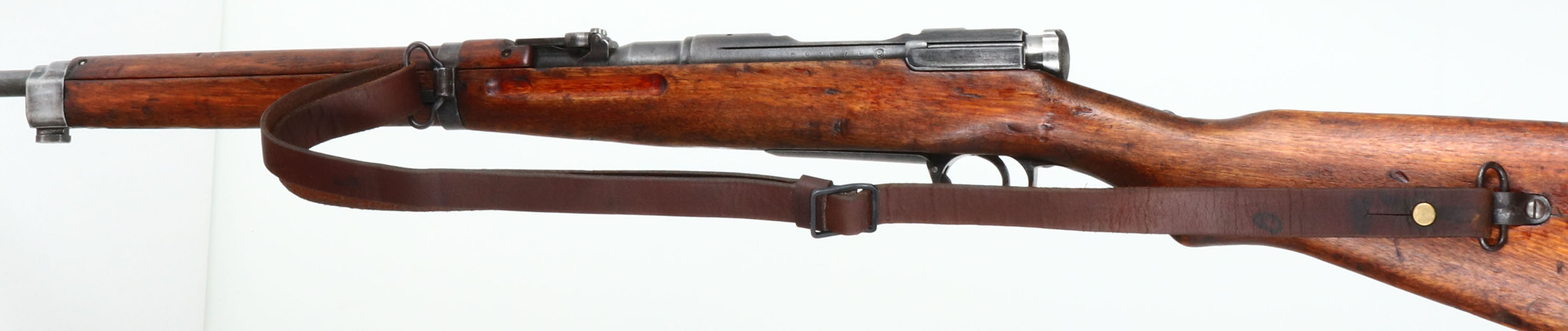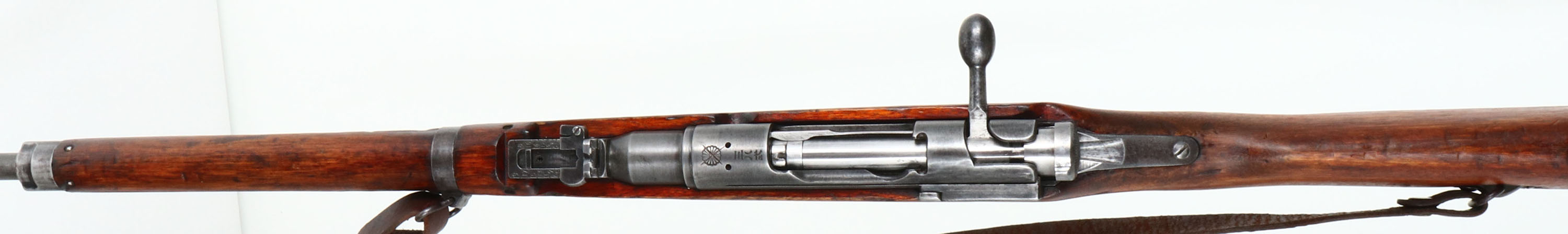 Nagoya Arsenal, Model: Type 38 Carbine, CAL: 6.5x50mmSR, MFG: 1935-42, S/N: 93679, Bolt action rifle, 19 1/4'' Barrel. The semi pistol grip wood stock is very good with nicks, dings, dents, scratches, & wear from age/use. The metal finish rates 30% overall with gunmetal gray showing through thinned bluing, left side of receiver is marked with S/N & arsenal mark, top of receiver is marked with X'd out chrysanthemum & ''TYPE 38'' in Japanese. Bore is Good, bright with roughness & worn rifling at muzzle. Barleycorn front sight with protective ears, V-notch ladder rear sight marked 4 to 20, both rear & front sight have white paint on them. Metal buttplate with patina. Missing cleaning rod, comes with leather sling. FFL or C&R Req. - Value: 250 to 500