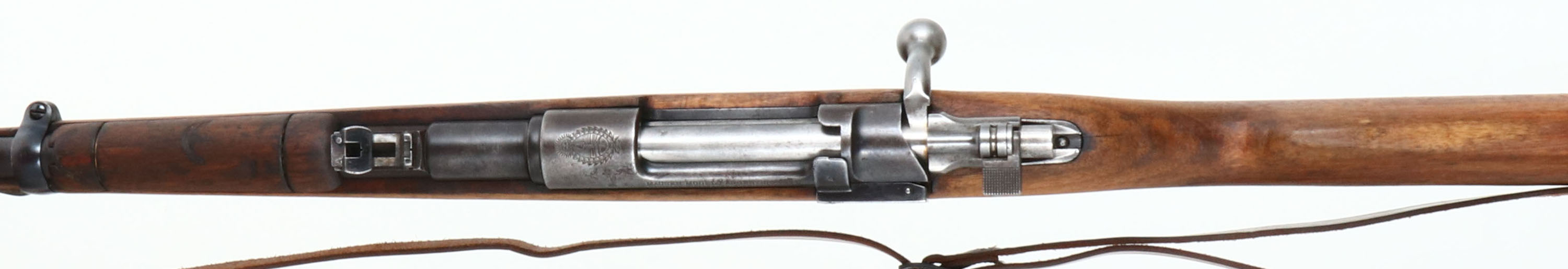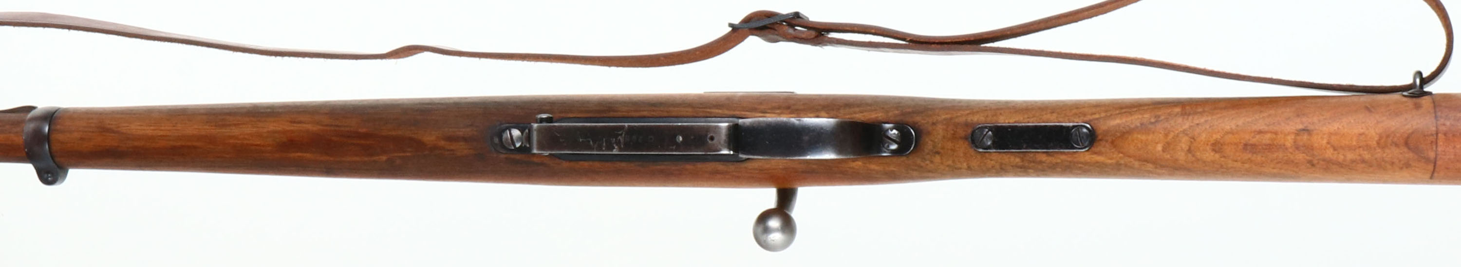 DWM, Argentino 1891 Engineers Carbine, CAL: 7.65x53mm, MFG: 1899, S/N: C2951, Bolt action rifle, 17 3/4'' barrel, The straight wrist wood stock is good, stock appears to have been sanded, replaced toe with wooden dowel securing. The metal on the barrel rates 60% with light scratches & areas worn gray near receiver, Receiver metal finish rates 20% with blue remaining in protected areas. Left side of the receiver is marked with proof marks, ''MAUSER MODELO ARGENTINO 1891'', ''DEUTSCHE WAFFEN-UND MUNITIONSFABRIKEN.'', top of receiver is marked with the Argentine coat of arms, right side of receiver is marked with S/N & importer marks, top of barrel has a proof mark, right side of barrel is marked with S/N, S/N matched bolt, magazine & barrel. Bore is very good, clean & bright with lightly thinned rifling. Barleycorn front sight with protective wings, V-notch ladder rear sight marked 4 to 14, metal buttplate with light patina. Side sling mounts. This rifle was originally made as a cavalry carbine, but in the early 1930's it was converted to a engineers carbine by adding a bayonet lug and side sling swivels, comes with leather sling. FFL or C&R Req. - Value: 500 to 1000
