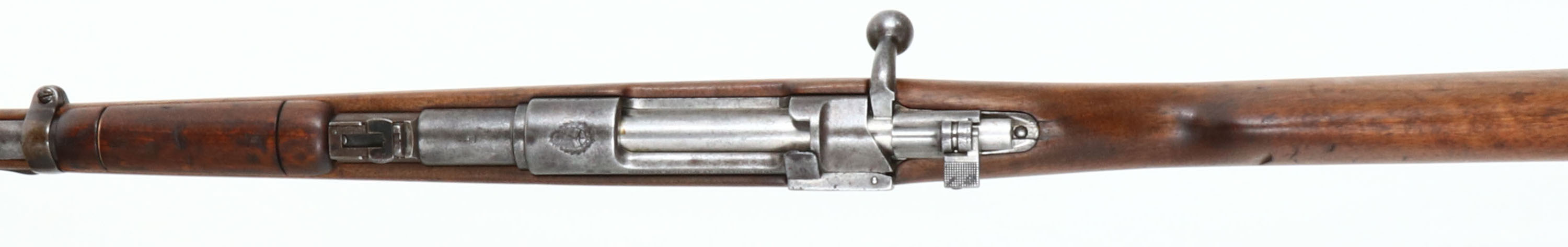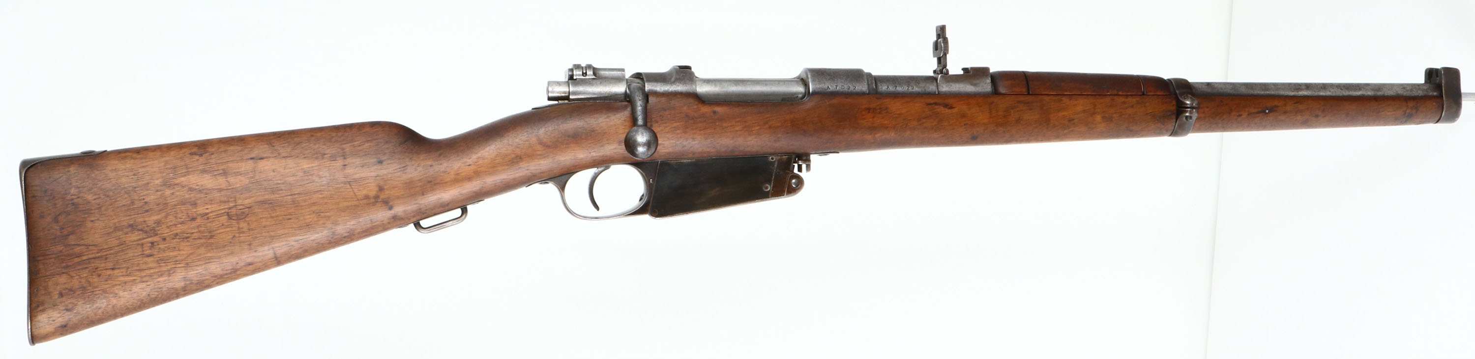 Loewe, Model: Argentino 1891 Cavalry Carbine, Cal: 7.65x53mm, MFG: 1895, S/N: A7022, Bolt action rifle, 17 3/4'' barrel, The straight wrist wood stock is very good with light nicks, dings, dents & wear from use/age, faint S/N mark on right side of stock by S/N on receiver, & it appears that it could match but most of the numbers are too faded to read, faint cartouche on top of upper handguard, faint cartouche on right side of stock by cheek weld. The metal on the barrel & receiver has toned to a even gunmetal gray with notes of patina. Left side of the receiver is marked with proof marks, ''MAUSER MODELO ARGENTINO 1891'', ''MANUFACTURA LOEWE BERLIN'', top of receiver is marked with a slightly worn but still visible Argentine coat of arms, right side of receiver is marked with S/N, top of barrel has a proof mark, right side of barrel is marked with S/N, S/N matched bolt & barrel. Bore is good, clean & bright with thinned rifling. Barleycorn front sight with protective wings, V-notch ladder rear sight marked 4 to 14, metal buttplate with light patina. bottom rear sling bar. Antique, No FFL Req - Value: 400 to 800