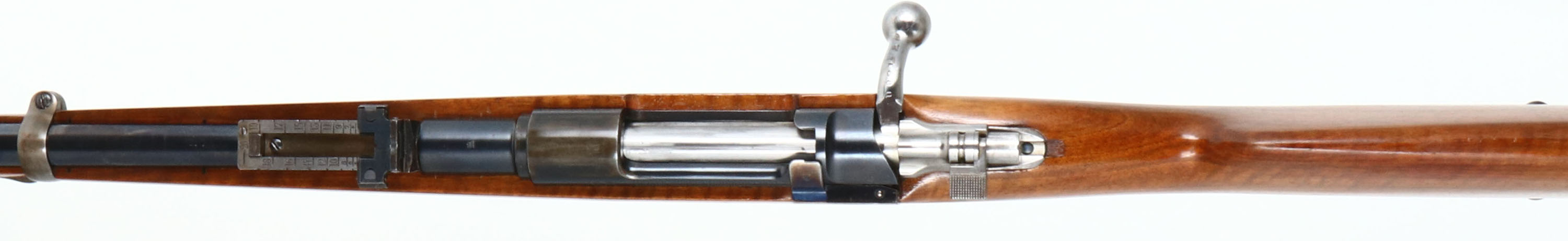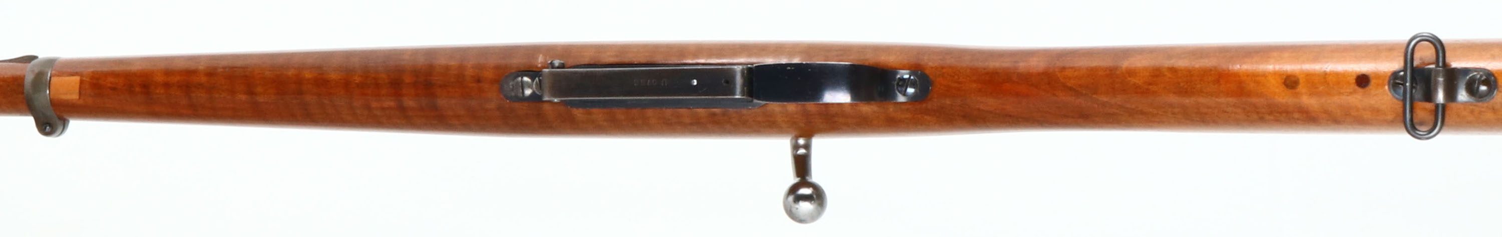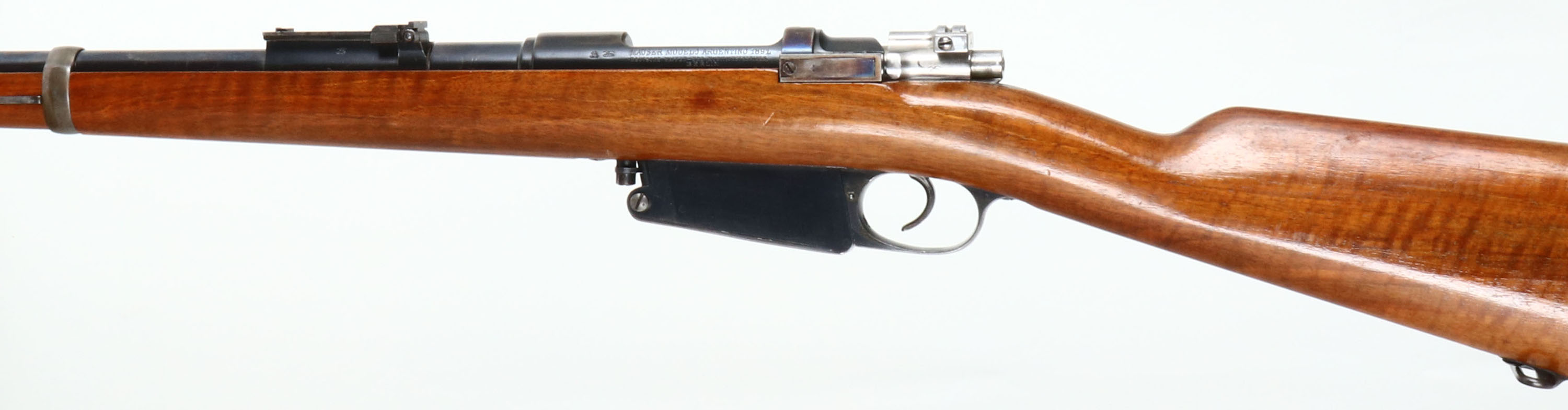 DWM, Model: 1891 Argentino, Cal: 7.65x53mm, MFG: 1900, S/N: U0756, Bolt action rifle, 17 3/4'' barrel, The straight wrist wood stock is good, 1/2'' by 1/2'' chip repair in bottom of stock right behind the rear barrel band, 2 1/2'' long tight repaired crack on bottom of stock emanating from front barrel band, crack also has wooden dowel reinforcements inlaid into the stock, two wooden dowl reinforcements inlaid into the bottom of the stock by rear sling mount, stock appears to have been sanded & re-finished, The metal finish rates 85% on the barrel with small spots of thinned bluing & light scratches, & 60% on the receiver, the spot were the coat of arms would have been has been ground down. Left side of the receiver is marked with proof marks, ''MAUSER MODELO ARGINTINO 1891'', ''DEUTSCHE WAFFEN-UND MUNITIONSFABRIKEN.'', ''BERLIN'', Right side of receiver is marked with S/N, top of barrel has a proof mark, right side of barrel is marked with S/N, S/N mismatched bolt, S/N matched barrel. Bore is excellent, bright with strong rifling. Barleycorn front sight with protective wings, U-notch ladder rear sight marked 4 to 20, metal buttplate with light patina. Bottom rear sling mount. This is a long rifle that has been cut down and made to look like a carbine. FFL or C&R Req. - Value: 250 to 500