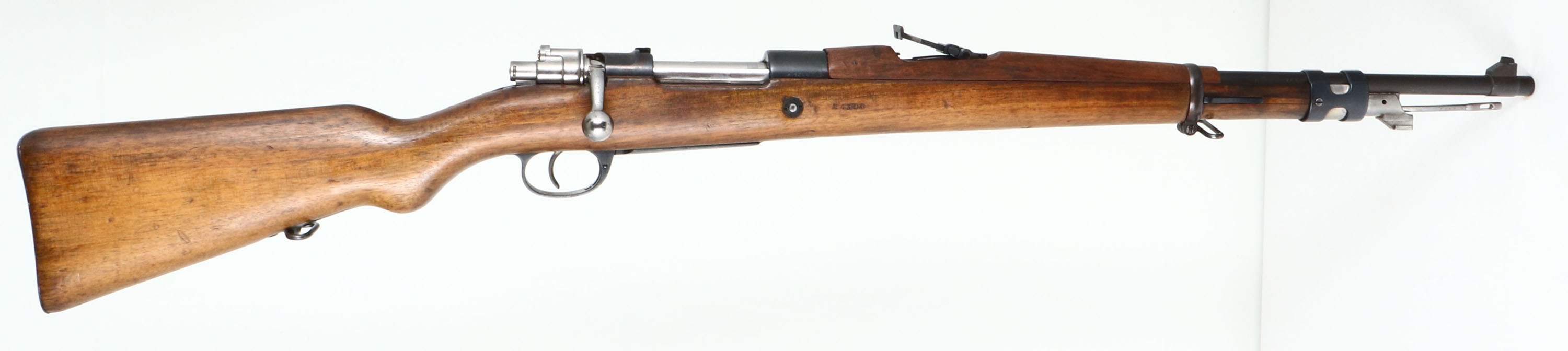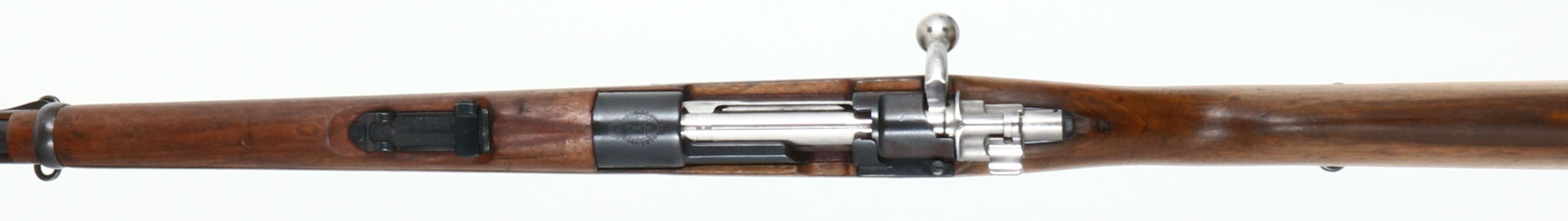 DWM, Model: Argentino 1909, Cal: 7.65x53mm Mauser, MFG: 1910, S/N: A4306, Bolt action rifle, 22 1/4'' barrel. The original semi-pistol grip wood stock is very good with light nicks, dings, dents, & wear from use/age, S/N marked into right side of stock just Infront of the recoil lug. The metal finish is a mix of original bluing with a few spots off added bluing, the finish rates 90% with light wear. Left side of receiver is marked ''MAUSER MODELO'', ''ARGENTINO 1909'', ''DEUTSCHE WAFFEN-UND'', ''MUNITIONSABRIKEN.BERLIN'', top of receiver is marked with the Argentina coat of arms, right side of receiver is marked with S/N, right side of barrel behind barrel band has a light stamp that reads ''765'', S/N matched Bolt & trigger guard. Bore is very good, strong rifling with light roughness. Barleycorn front sight, V-notch tangent rear sight marked 2 to 14. Metal buttplate with light wear. Bottom sling mounts, comes with cleaning rod. FFL or C&R Req - Value: 300 to 600