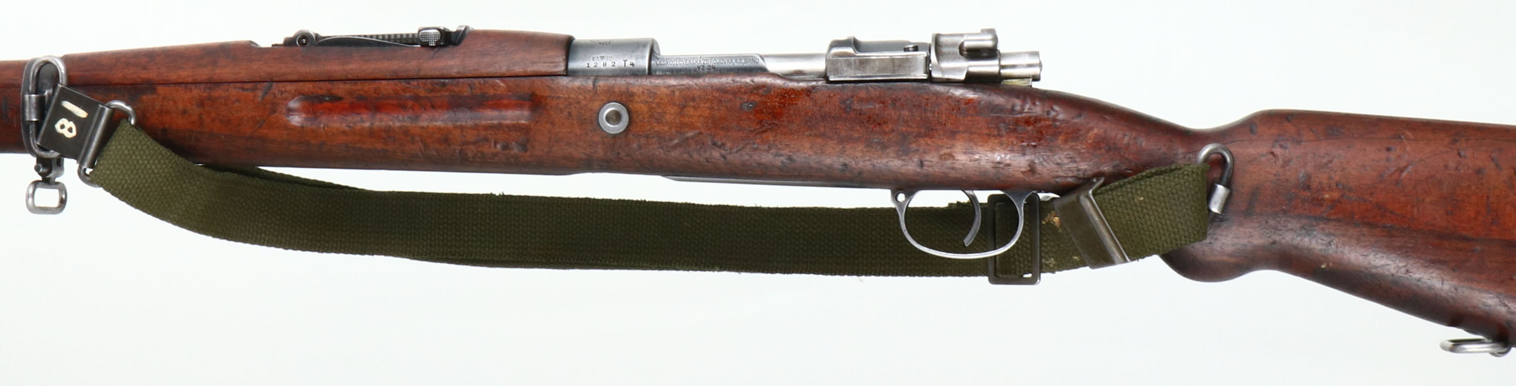 Zbrojovka Brno, Model: VZ 24 Romanian Contract, Cal: 7.92x57mm, MFG: 1938, S/N: 1282, bolt action rifle, 23 1/2'' Barrel, The semi-pistol grip wood stock is very good with scratches, nicks, dings, dents, & wear from use/age, stock appears to have been forced S/N matched, likely a arsenal repair, left side of stock by buttplate stamped with S/N & ''ER 26617'' with one line through it, right side of stock has a unmarked unit disc, The metal finish rates 40% with areas of thinned bluing showing gray, left side of receiver is marked ''CESKOSLOVENSKA ZBROJOVKA,A.S,BRNO'', ''VZ.24'', ''E3'' faint marking ''38'', S/N, top of receiver is marked with ground down Rampart Lion crest, with edges of crest still remaining, end of barrel is stamped with importer marks, S/N mismatched bolt. Bore is very good, strong rifling with light roughness, has been counter bored. Barleycorn front sight with protective ears & white paint added to post, tangent V-notch rear sight marked 3 to 20 & has two white dots of paint added. Metal buttplate that's worn gray. Bottom & side sling swivels, missing cleaning rod. FFL or C&R Req - Value: 250 to 500