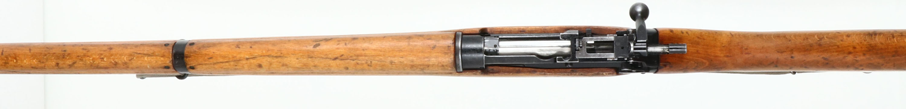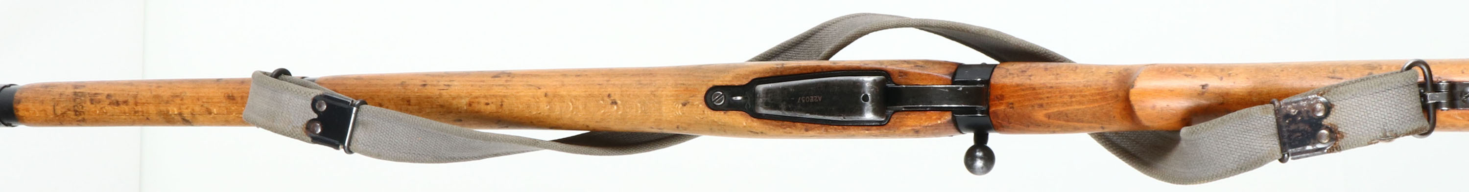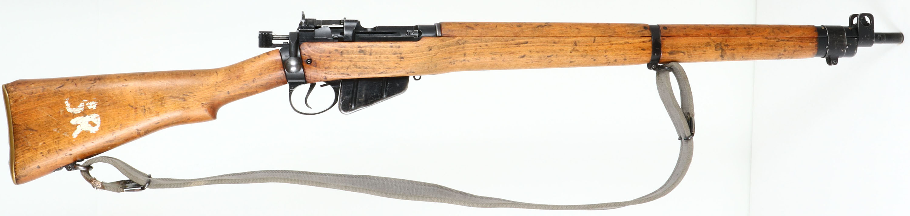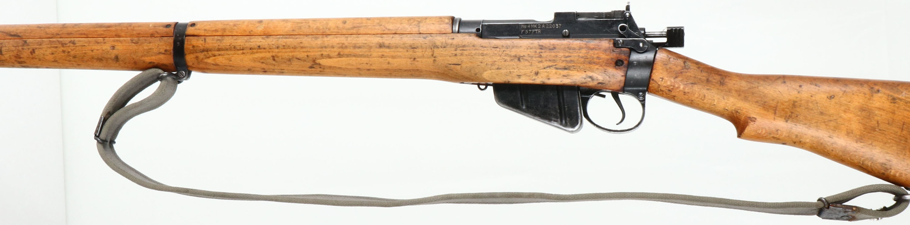 ROF Fazakerley, Model: No4 Mk2, Cal: .303 British, MFG: 1949-55, S/N: A22037, Bolt action rifle, 25 1/4'' Barrel. The semi-pistol grip wood stock is very good with light scratches, nicks, dings, dents, & wear from use/age, white paint marks on right side of stock by buttplate, faint marking of S/N on bottom of stock by muzzle, ''F'' over ''55'' & ''G'' over ''23'' cartouches on bottom of stock by trigger, ''H'' over ''35'' cartouche on bottom of stock right behind magazine. The metal finish rates 80% overall with spots of lightly worn bluing. Left side of receiver is marked, ''No4 MK 2'' S/N, ''F 57 FTR'', & importer markings, S/N matched Bolt, magazine, & stock. Bore is very good, bright with light roughness. Blade front sight with protective ears & white paint on post, two position flip up ladder aperture rear sight marked 2 to 13. brass trapdoor buttplate with original pull through inside. Bottom sling swivels, comes with period correct canvas sling. FFL Or C&R Req - Value: 400 to 800