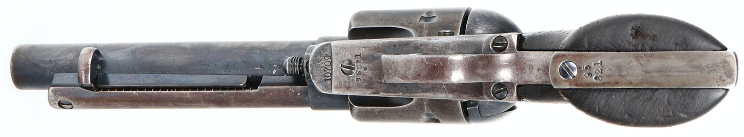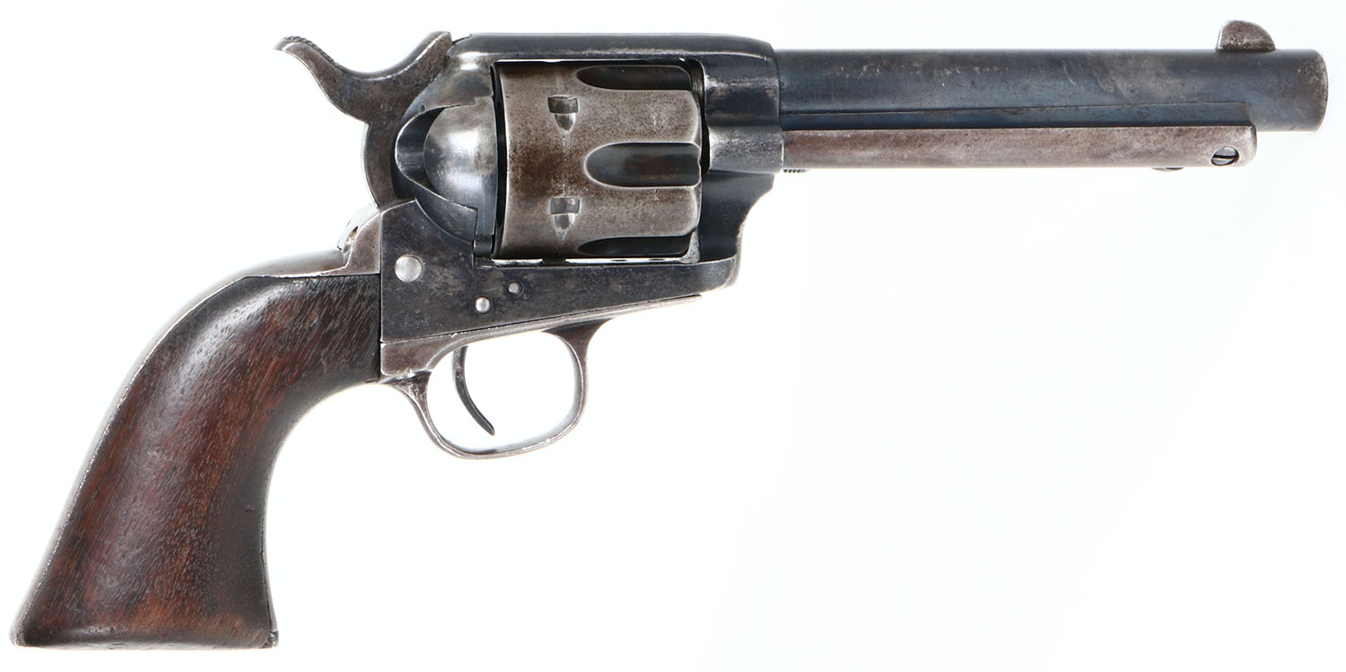 RARE Colt, SAA, 8th Cavalry U.S Artillery Revolver, CAL: 45 LC, MFG: 1874 (frame SN), SN: 10709, Single Action Revolver, 5 1/2'' barrel. 2nd year production. Records from Springfield Research Service list remaining information on revolvers SN#'s 10695 & 10715. These revolvers were issued to Troop C of the 8th U.S. Cavalry in 1876. They served in NV, OR, AZ, NM & TX during the Indian Wars between 1867 & 1888. This pistol's SN falls between these two revolvers & likely had the same history. Although not marked, or no longer visible, Ainsworth inspected these first of the U.S. Colt SAA revolvers, which were later converted, as seen only through SN 14998 & rarely encountered today. These guns were frequently rebuilt in arsenals & therefore are rarely encountered with matching SN's. The top of the barrel is stamped ''COLT'S PT. F.A. MFG. Co HARTFORD, CT. U.S.A.'', the left side of the frame is marked with a two line patent dates ''PAT. SEPT. 19, 1871, JULY. 2, 1872'', followed by the U.S. ownership stamp. The frame is stamped ''10709'', the trigger guard is stamped ''95821'' over ''G'', the butt is also stamped ''95821'' over ''G''. Any stampings on the bottom of the grips are no longer visible''. The wood grips are very good, as lightly sanded & reoiled. There are tiny corner & edge chips & other very minor contusions & scrapes. The metal blue finishes remains in more protected areas at 30%, with the rest worn gun metal gray, with a thin brown patina. Bore is excellent, with minor spotting & speckling. The barrel carries a blade front sight & the frame has an integrated rear groove. Action is tight & smooth, with the cylinder timing correctly functioning properly. The Colt Single Action Army is a worldwide icon of the U.S. & the Western Frontier. Wielded by the long arm of the law, military & bad men, the famous Single Action Army became well-known as the Peacemaker. This Artillery model & likely 8th Cavalry example is a top level SAA collectible.* Antique, No FFL Req. - Value: 5000 to 10000