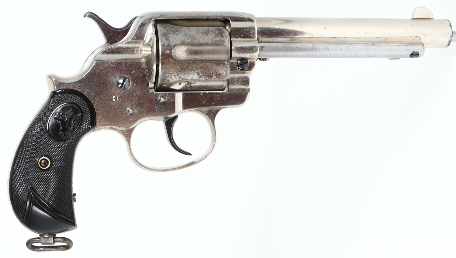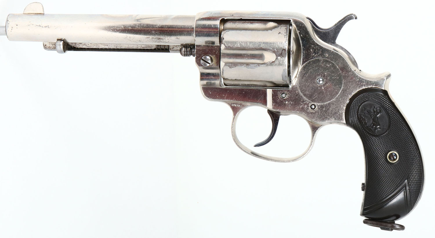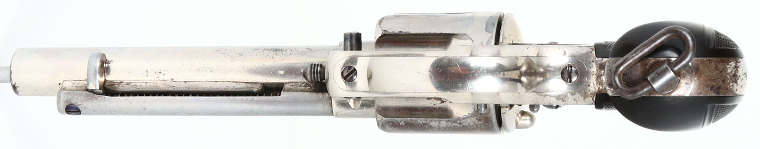 RARE Colt, Model 1878, ''PALL MALL'' Stamping, CAL: .476 ENFIELD, MFG: 1885, SN: 15744, Double Action Revolver, 5 1/2'' barrel. The top of the barrel has the rare marking ''COLT'S PT. F.A. MFG. CO. HARTFORD CT. U.S.A. DEPOT 14 PALL MALL LONDON''. The bottom is marked with two British proof marks. The cylinder has British proofs at the rear of each flute. The left side of the trigger guard is marked ''.476 CAL'' The loading gate & left side of backstrap is marked with assembly numbers ''567''. The full SN can be found on the butt, ahead of the lanyard loop. The Rampant Colt checkered hard rubber grips, with smooth borders, wedge-shaped smooth base are excellent. The nickel metal finish is very good with some spotting & speckling. Oxide blued trigger & hammer. Bore is very good & bright. The barrel holds a blade front sight. Lanyard swivel loop present. The .476 Enfield cartridge would have been more popular in England during the 1880's & 90s than most of Colts other offerings. The Pall Mall barrel address & Enfield chambering is more scarce than many other variations making it fairly rare & collectible. This revolver would make a great addition to any Colt or British revolver collection. Antique, No FFL Req. - Value: 1500 to 2500