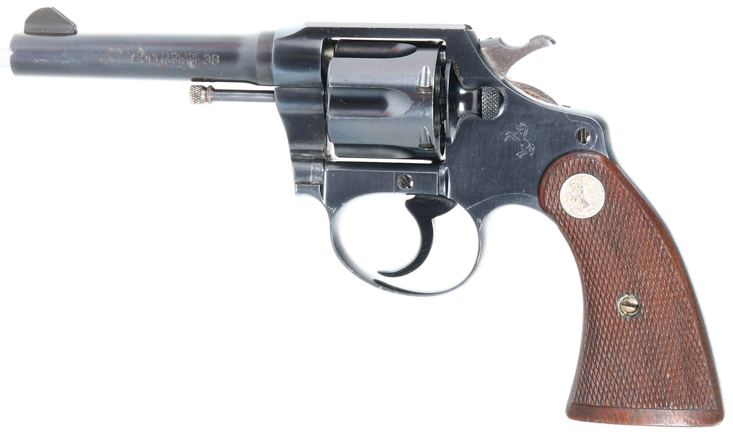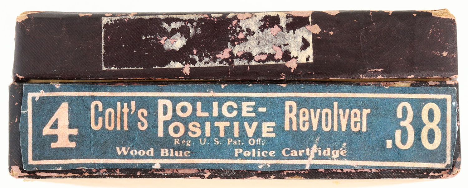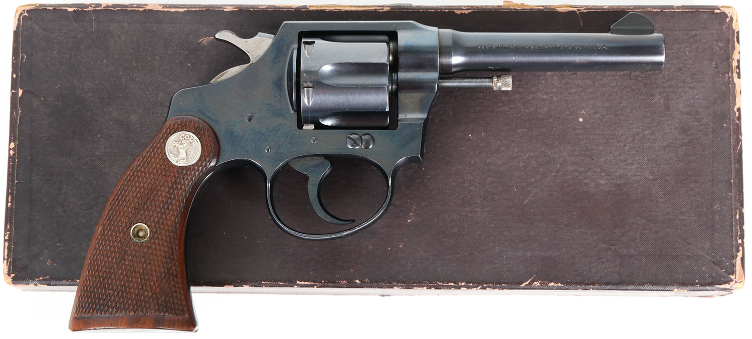 BOXED Colt, Police Positive, CAL: 38 S&W, MFG: 1919, SN: 181981. Double Action Revolver, 4'' barrel. The right side of the barrel is marked ''COLT'S PT F.A. MFG. CO. HARTFORD CONN. U.S.A.''. The left side of the barrel is marked ''COLT POLICE POSITIVE 38''. The left side of the frame is marked with the Rampant Colt logo behind the cylinder release. The full SN can be found on the frame & cylinder swing gate. The original, Colt marked checkered wood grips are excellent. The factory metal blue finish rates 99%. Bore is excellent & bright. The barrel holds a blade front sight. Comes in the original factory box, with full interior labels, wax paper & Special Instruction pamphlet. FFL or C&R Req. - Value: 800 to 1500