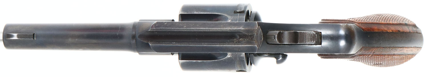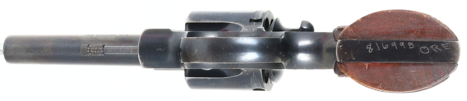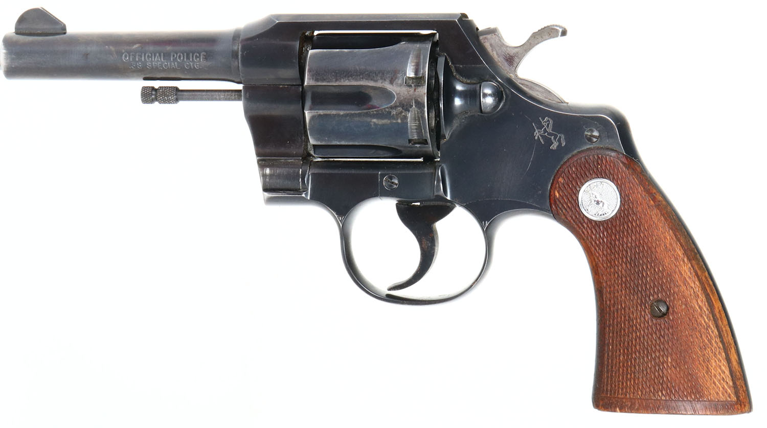 Colt, Official Police, CAL: 38 SPL, MFG: 1964, SN: 8696486. Double Action Revolver, 4'' barrel. The right side of the barrel is marked ''COLT'S PT F.A. MFG. CO. HARTFORD CONN. U.S.A.''. The left side of the barrel is marked ''OFFICAL POLICE 38 SPECIAL CTG.''. The left side of the frame is marked with the Rampant Colt logo behind the cylinder release. The full SN can be found on the frame & cylinder swing gate. The original, Colt silver medallion checkered wood grips are excellent, with minor rubs & tiny nicks to the bottom edge. The factory metal blue finish rates 90%. Bore is excellent & bright. The barrel holds a blade front sight. Has a DL# scratched onto the bottom strap. Functions smoothly. FFL or C&R Req. - Value: 300 to 600