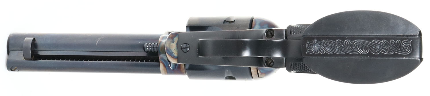 BOXED, Colt, New Frontier 2nd Gen, CAL: 22 LR/22 MAG, MFG: 1972, SN: G55740, Single Action Revolver, 4 3/8'' barrel. The E. Pluribus Unum & Rampant Colt checkered black plastic grips are excellent. The metal blue finish on the barrel, cylinder & trigger guard is 99%. The frame is case-hardened, retaining full case-colors. Bore is excellent. The frame holds an adjustable rear sight & large ramp blade front sight. Comes in original box, with paperwork, three prong Colt tool & seperately boxed 22 MAG cylinder. A high condition example of a 2nd Gen Colt revolver. FFL or C&R Req. - Value: 600 to 1200