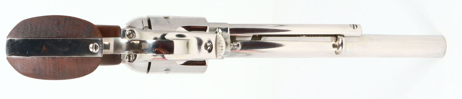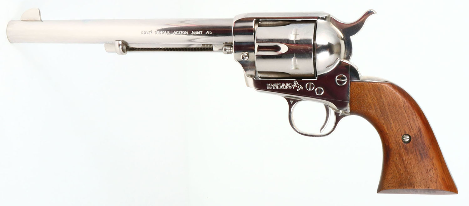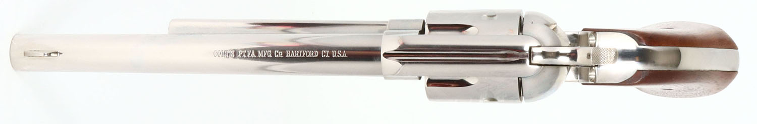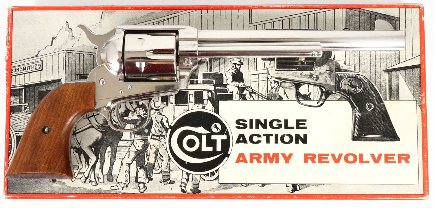 BOXED, Colt, Model Single Action Army, Second Generation, CAL: .45, MFG: 1970, SN:54180SA, Single Action Revolver, 7 1/2'' barrel. The left side of barrel is stamped ''COLT SINGLE ACTION ARMY .45''. The original Rampant Colt medallion, smooth wood grips are near Mint. The nickel rates 99%. Bore is mint. The barrel holds a tall front blade. Comes in the original black, orange & white picture box, with picture interior dividers & paperwork. Excellent boxed Colt revolver. FFL or C&R Req. - Value: 2000 to 3000