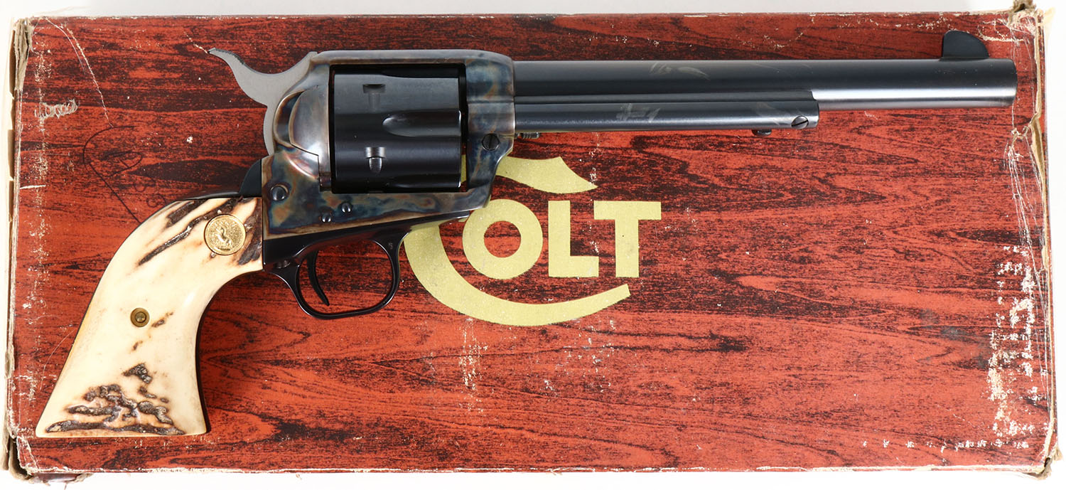 BOXED Colt, Single Action Army (P1870), CAL: .45 COLT, MFG: 1978-93, SN: SA11750. Single Action Revolver, 7 1/2'' barrel. The top of the barrel is marked ''COLT'S PT F.A. MFG. CO. HARTFORD CT. U.S.A.'', The left side of the barrel is marked ''COLT SINGLE ACTION ARMY 45''. The left side of the frame is marked with the Rampant Colt logo above the trigger guard & next to patent dates. The full SN can be found on the frame. The fantastic original stag & Rampant Colt medallion grips are excellent. The factory metal blue finishes rate 99%. The case-hardened frame displays vivid case-colors. Bore is excellent & bright. The barrel holds a blade front sight. Comes in the original factory wood grain box, with Colt ''Congratulations'' letter, hang tag, Owner instruction booklet & other pamphlets. FFL Req. - Value: 1500 to 2500