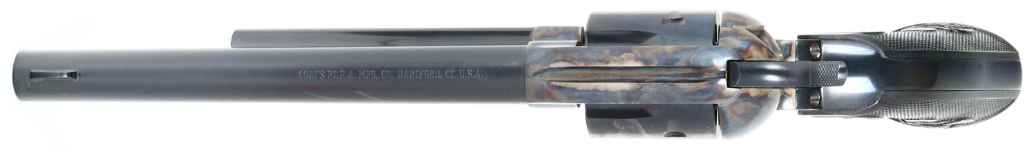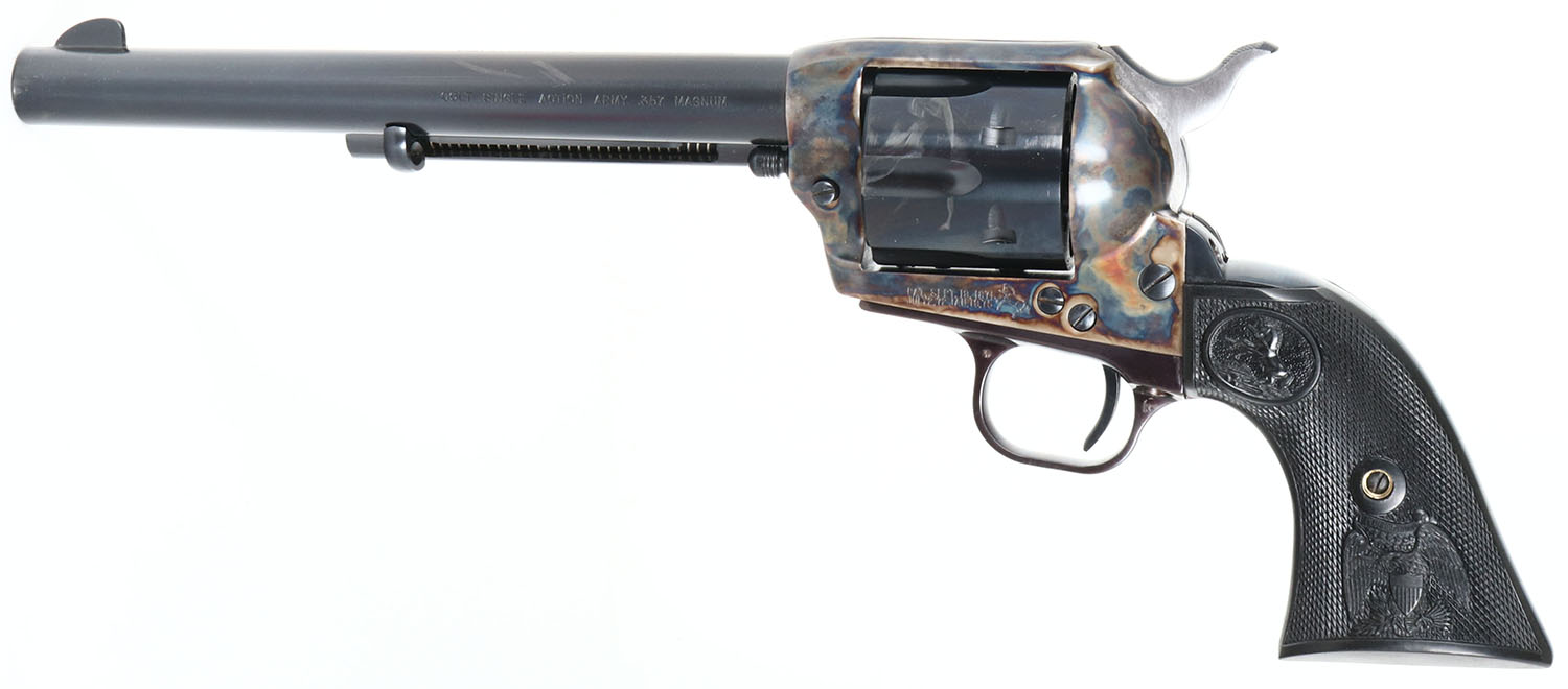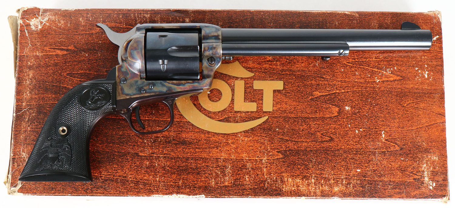 BOXED Colt, Single Action Army (P1670), CAL: .357 MAG, MFG: 1978-93, SN: SA15852. Single Action Revolver, 7 1/2'' barrel. The top of the barrel is marked ''COLT'S PT F.A. MFG. CO. HARTFORD CT. U.S.A.'', The left side of the barrel is marked ''COLT SINGLE ACTION ARMY 357 MAGNUM''. The left side of the frame is marked with the Rampant Colt logo above the trigger guard & next to patent dates. The full SN can be found on the frame. The original Rampant Colt medallion & eagle plastic grips are excellent. The factory metal blue finishes rate 99%. The case-hardened frame displays vivid case-colors. Bore is excellent & bright. The barrel holds a blade front sight. Comes in the original factory wood grain box, with hang tag, Owner instruction booklet & other pamphlets. FFL Req. - Value: 1500 to 2500