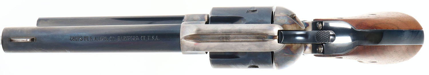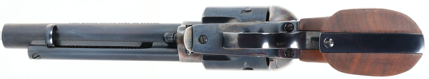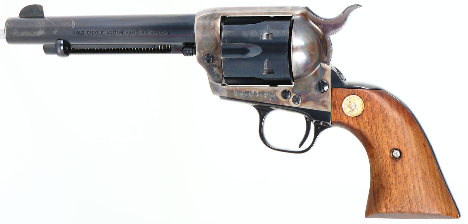 BOXED Colt, Single Action Army (P1850), CAL: .44 Special, MFG: 1978-93, SN: SA32699. Single Action Revolver, 5 1/2'' barrel. The top of the barrel is marked ''COLT'S PT F.A. MFG. CO. HARTFORD CT. U.S.A.'', The left side of the barrel is marked ''COLT SINGLE ACTION ARMY 44 SPECIAL''. The left side of the frame is marked with the Rampant Colt logo above the trigger guard & next to patent dates. The full SN can be found on the frame. The original Rampant Colt medallion & wood grips are excellent. The factory metal blue finishes rate 99%. The case-hardened frame displays vivid case-colors. Bore is excellent & bright. The barrel holds a blade front sight. Comes in the reproduction wood grain box. FFL Req. - Value: 1400 to 2200