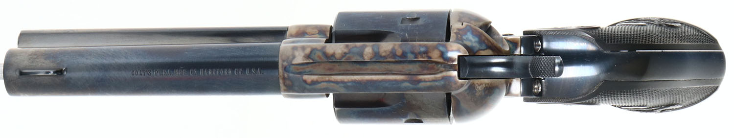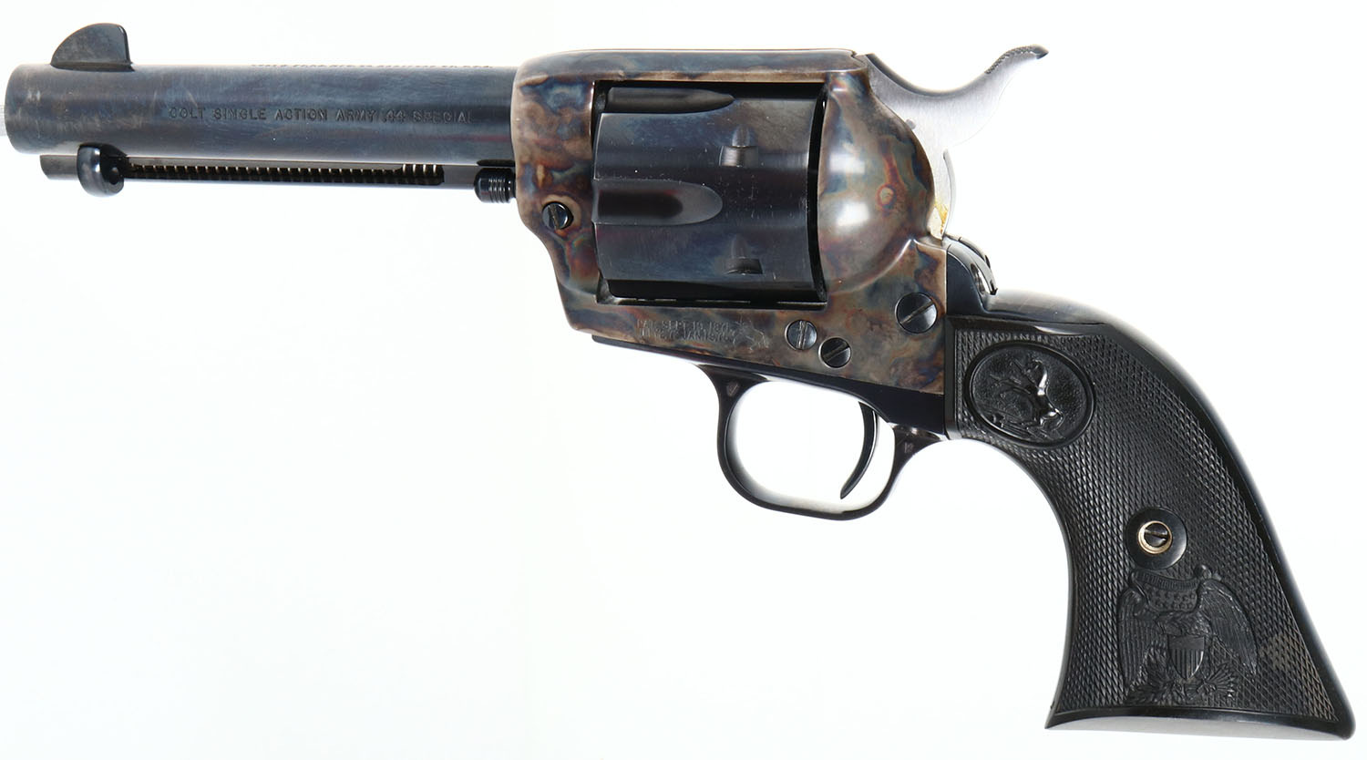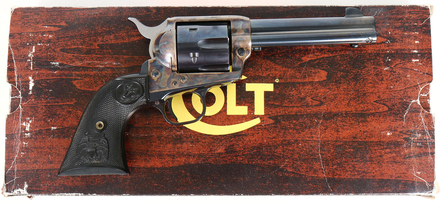 BOXED Colt, Single Action Army (P1850), CAL: .44 Special, MFG: 1978-93, SN: SA51771. Single Action Revolver, 4 3/4'' barrel. The top of the barrel is marked ''COLT'S PT F.A. MFG. CO. HARTFORD CT. U.S.A.'', The left side of the barrel is marked ''COLT SINGLE ACTION ARMY 44 SPECIAL''. The left side of the frame is marked with the Rampant Colt logo above the trigger guard & next to patent dates. The full SN can be found on the frame. The original Rampant Colt & eagle plastic grips are excellent. The factory metal blue finishes rate 99%. The case-hardened frame displays vivid case-colors. Bore is excellent & bright. The barrel holds a blade front sight. Comes in the original factory wood grain box, with hang tag, owner instruction booklet & other pamphlets. FFL Req. - Value: 2000 to 3000