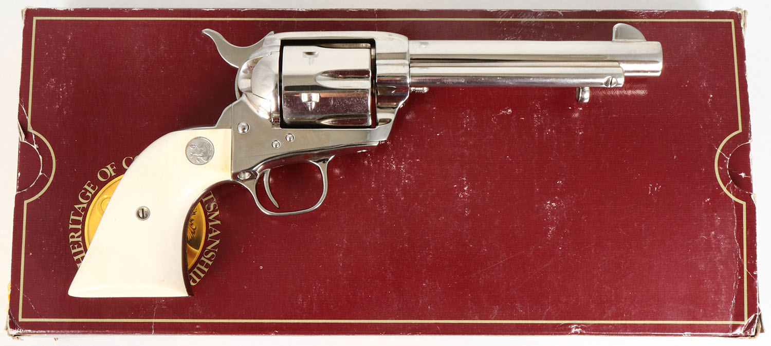 BOXED, Colt, Model Single Action Army, NICKEL (P2951), CAL: 44-40, MFG: 1988, SN: SA72210, Single Action Revolver, 51/2''' barrel. This is a nearly New revolver & stored in its original box. The left side of barrel is stamped ''COLT SINGLE ACTION ARMY .44-40''. The original Rampant Colt medallion & smooth faux ivory grips are excellent. The metal nickel finish rates 99%. Bore is mint. The barrel holds a tall front blade. Comes in a Colt brown picture box, with hang tag, booklets & paperwork. Box does show edge wear. Excellent boxed nickeled Colt revolver. FFL Req. - Value: 1500 to 2500