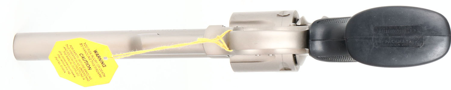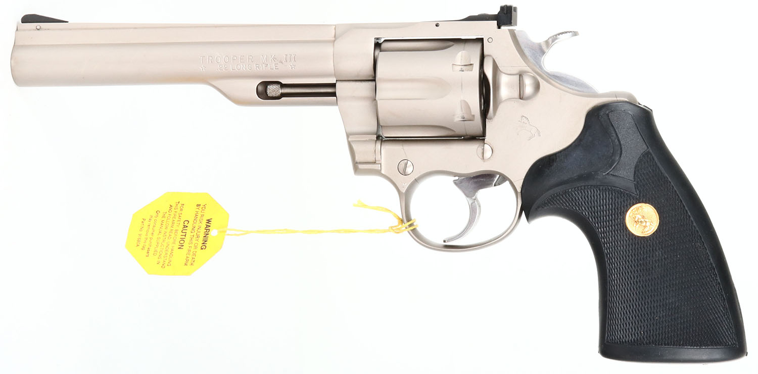 BOXED, Colt, Trooper MK III, CAL: .22 LR, MFG: 1981, SN: Y40996, Double Action Revolver, 6'' barrel. The Colt Trooper MK III was introduced in 1969, in caliber 22LR, 22 WMR, 357 MAG or 38 SPL. This example is very desirable, chambered in .22 LR, which according to the Blue Book brings an additional 30% premium. The left side of barrel is stamped in two lines, ''TROOPER MK III .22 LONG RIFLE''. The gold Colt medallion checkered rubber grips are minty. The E-Nickel (Electric Nickel) finish is mint. Bore is mint. The frame holds a ''U'' notch rear sight & blade sight. Hanging tag still on gun. This gun comes in the original box, with owners manual. Comes with the colt purchase letter from Colt President, in the original SN matching wood grain box, with packaging, owners manual & paperwork. Box has storage wear, tears & split seams, with end flaps having been taped. FFL Req. - Value: 1000 to 2000
