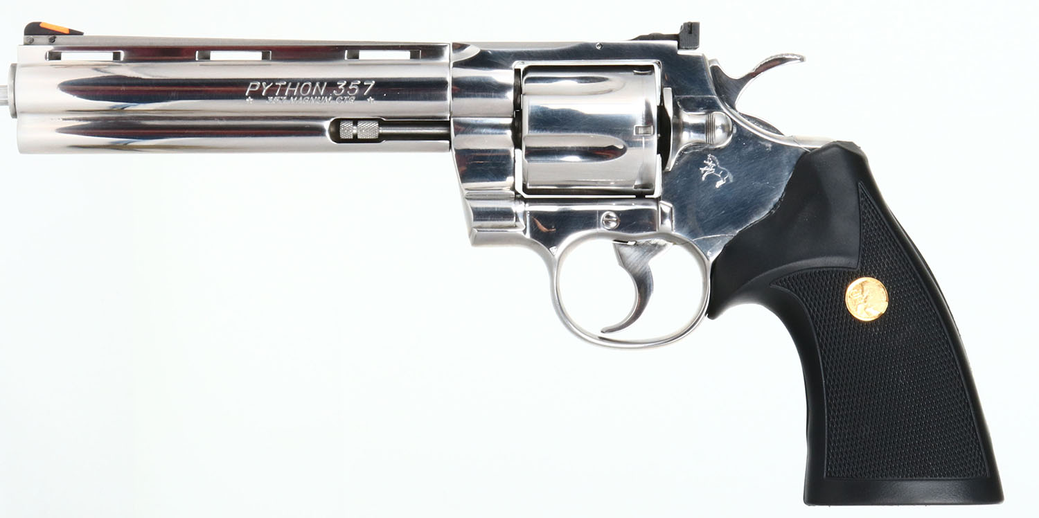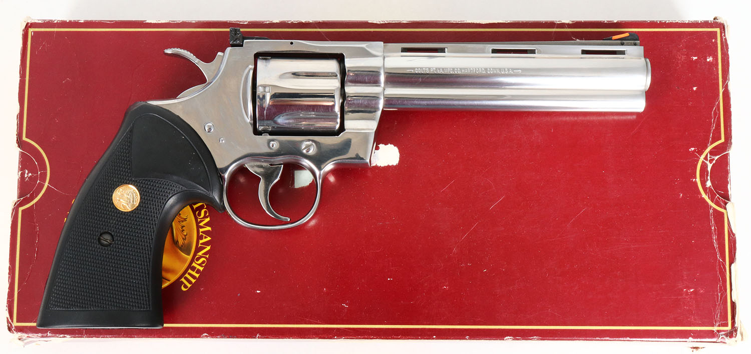 BOXED, Colt, Model Python, B STS Finish CAL: .357 Magnum, MFG: 1988, SN: T82334, Double Action Revolver, 6'' barrel. The Colt Python was introduced as a premium model in 1955, in caliber .357 Magnum. The Python is built on the large I-frame & has a reputation for accuracy, smooth trigger pull, & a tight cylinder lock-up. It has a 6-shot swing-out cylinder & was available in Python blue, Royal blue, Python nickel & Python stainless steel finishes. Some firearm collectors & writers have described the Python as ''the finest production revolver ever made''. It has a wide serrated target hammer, ventilated rib, & fully adjustable target quality rear sights. The left side of barrel is stamped ''PYTHON 357 * .357 MAGNUM CTG * ''. The Rampant Colt gold medallion, checkered Pachmayr grips on this example are near mint. The Bright Stainless (Code B STS) finish is near mint. Bore is mint. The satin finished top of the ventilated rib barrel holds a screw height adjusting ''U'' notch rear sight & front blade sight. This gun comes in the original #'s matching Colt picture box, with Colt letter, instruction manual & additional paperwork. Highly collectible in this condition & desirable in mirror Bright Stainless variation. FFL Req. - Value: 2500 to 3500