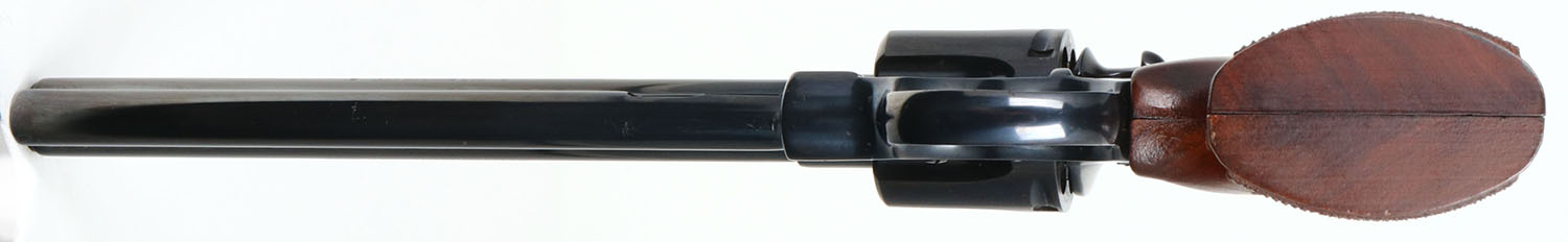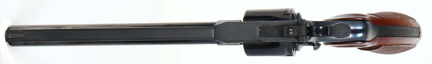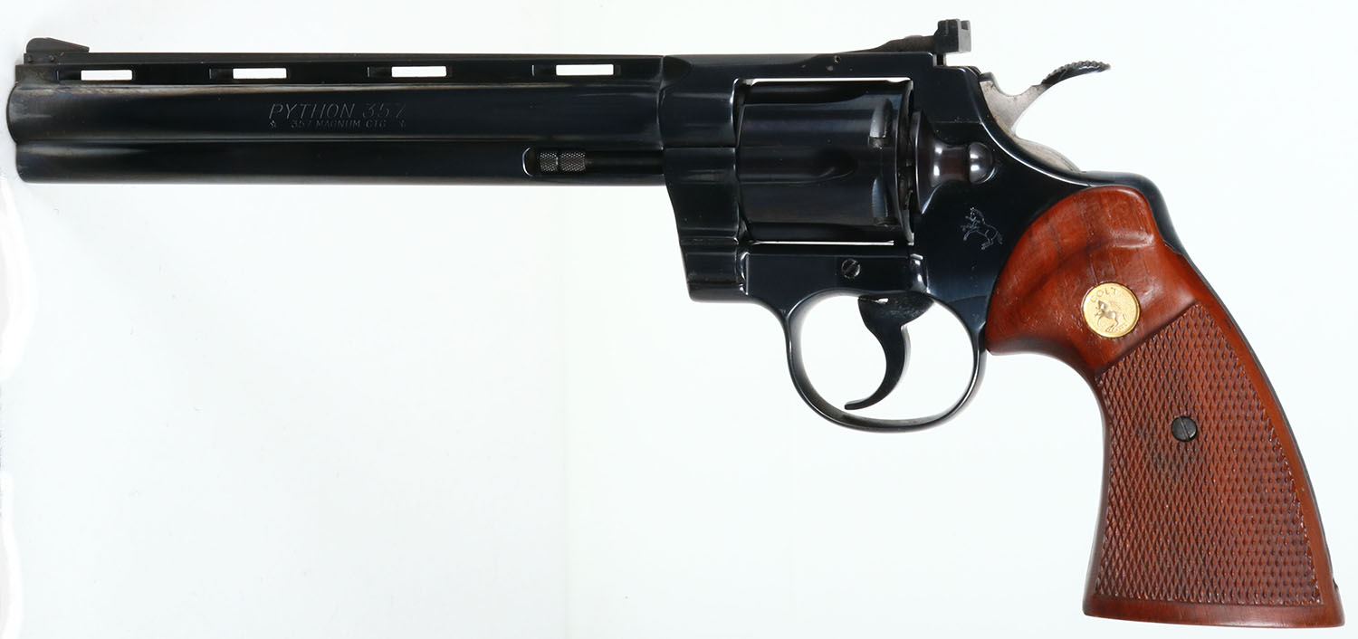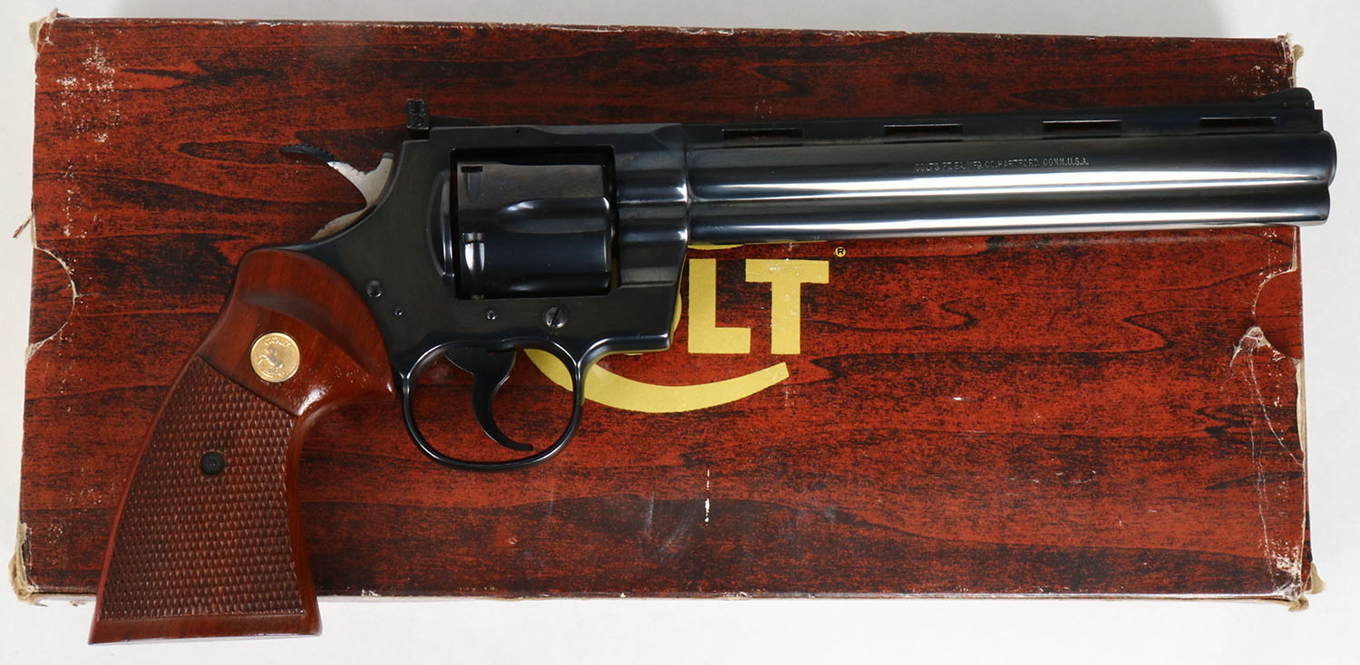 BOXED, Colt, Model Python, Python Blue, CAL: 357 Magnum, MFG: 1981, SN: K20807, Double Action Revolver, 8'' barrel. The Colt Python was introduced as a premium model in 1955, in caliber .357 Magnum, with some rare caliber variations produced along the way. The Python is built on the large I-frame & has a reputation for accuracy, smooth trigger pull, & a tight cylinder lock-up. It has a 6-shot swing-out cylinder & was available in Python blue, Royal blue, Python nickel & Python stainless steel finishes. Some firearm collectors & writers have described the Python as ''the finest production revolver ever made''. It has a wide serrated target hammer, ventilated rib, & fully adjustable target quality rear sights. The left side of barrel is stamped ''PYTHON .357 * .357 MAGNUM CTG * ''. The Rampant Colt gold medallion, checkered wooden grips on this example are near mint. The Python Blue (sometimes referred to as Royal Blue) finish is minty, with a few tiny speckles. Bore is mint. The satin black finished top of the ventilated rib barrel holds a screw height adjusting ''U'' notch rear sight & black serrated blade front sight. This gun comes in an original Colt wood grain box, with instruction manual & other original papers. FFL Req. - Value: 2500 to 3500