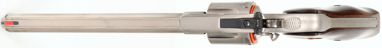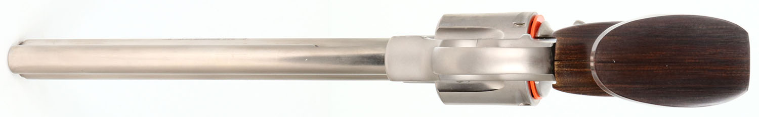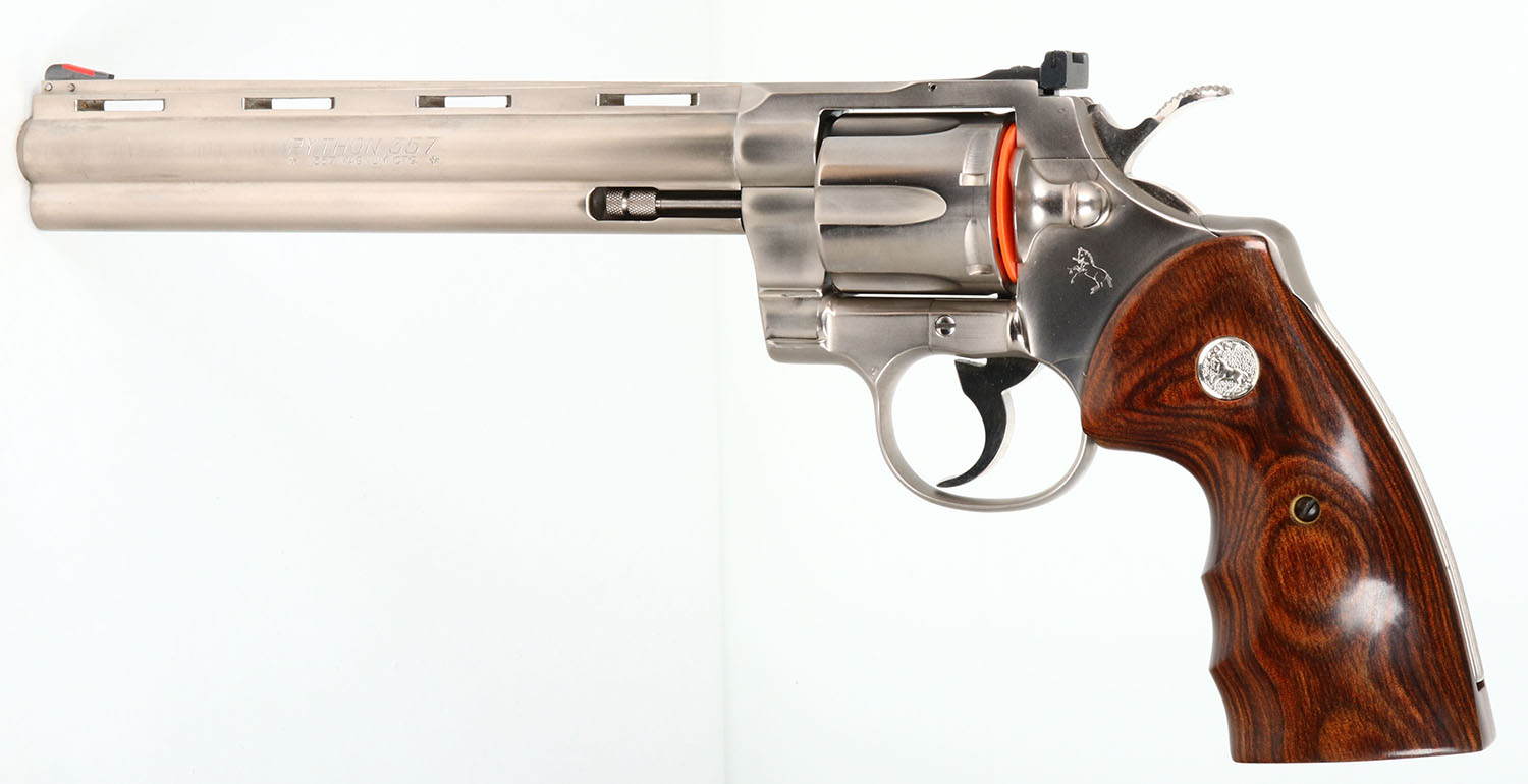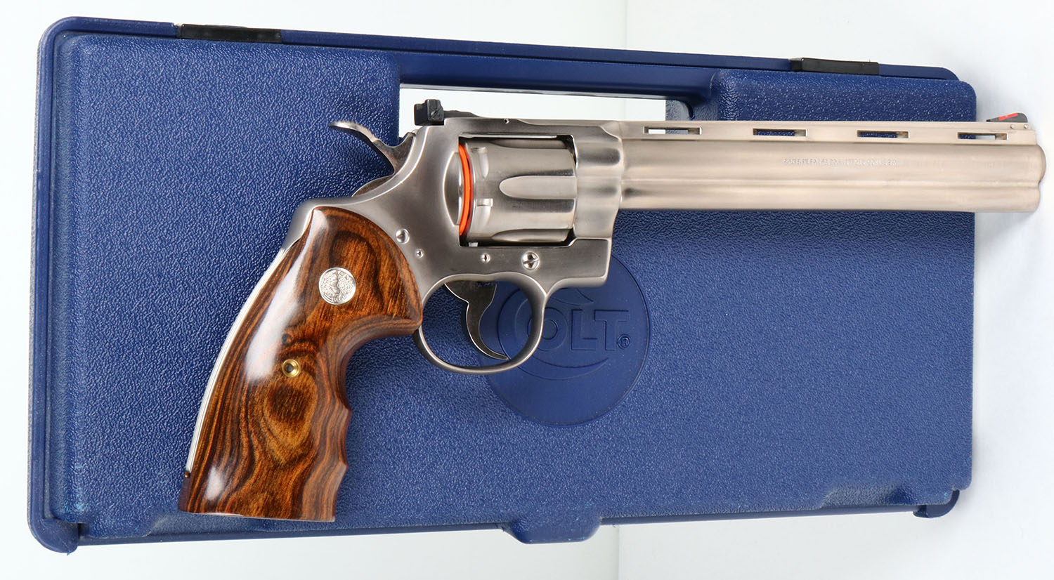SCARCE CASED, Colt, Model Python Stainless Steel, CAL: 357 Magnum, MFG: 1981, SN: K61490, Double Action Revolver, 8'' barrel. The Colt Python was introduced as a premium model in 1955, in caliber .357 Magnum, with some rare caliber variations produced along the way. The Python is built on the large I-frame & has a reputation for accuracy, smooth trigger pull, & a tight cylinder lock-up. It has a 6-shot swing-out cylinder & was available in Python blue, Royal blue, Python nickel & Python stainless steel finishes. Some firearm collectors & writers have described the Python as ''the finest production revolver ever made''. It has a wide serrated target hammer, ventilated rib, & fully adjustable target quality rear sights. The left side of barrel is stamped ''PYTHON .357 * .357 MAGNUM CTG * ''. The Rampant Colt silver medallion, smooth finger grooved grips on this example are near mint. The stainless steel finish is minty. Bore is mint. The satin finished top of the ventilated rib barrel holds a screw height adjusting ''U'' notch rear sight & black serrated blade front sight. This gun comes in a blue Colt hard case. FFL Req. - Value: 3000 to 4000