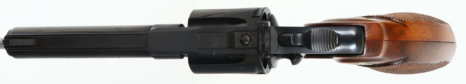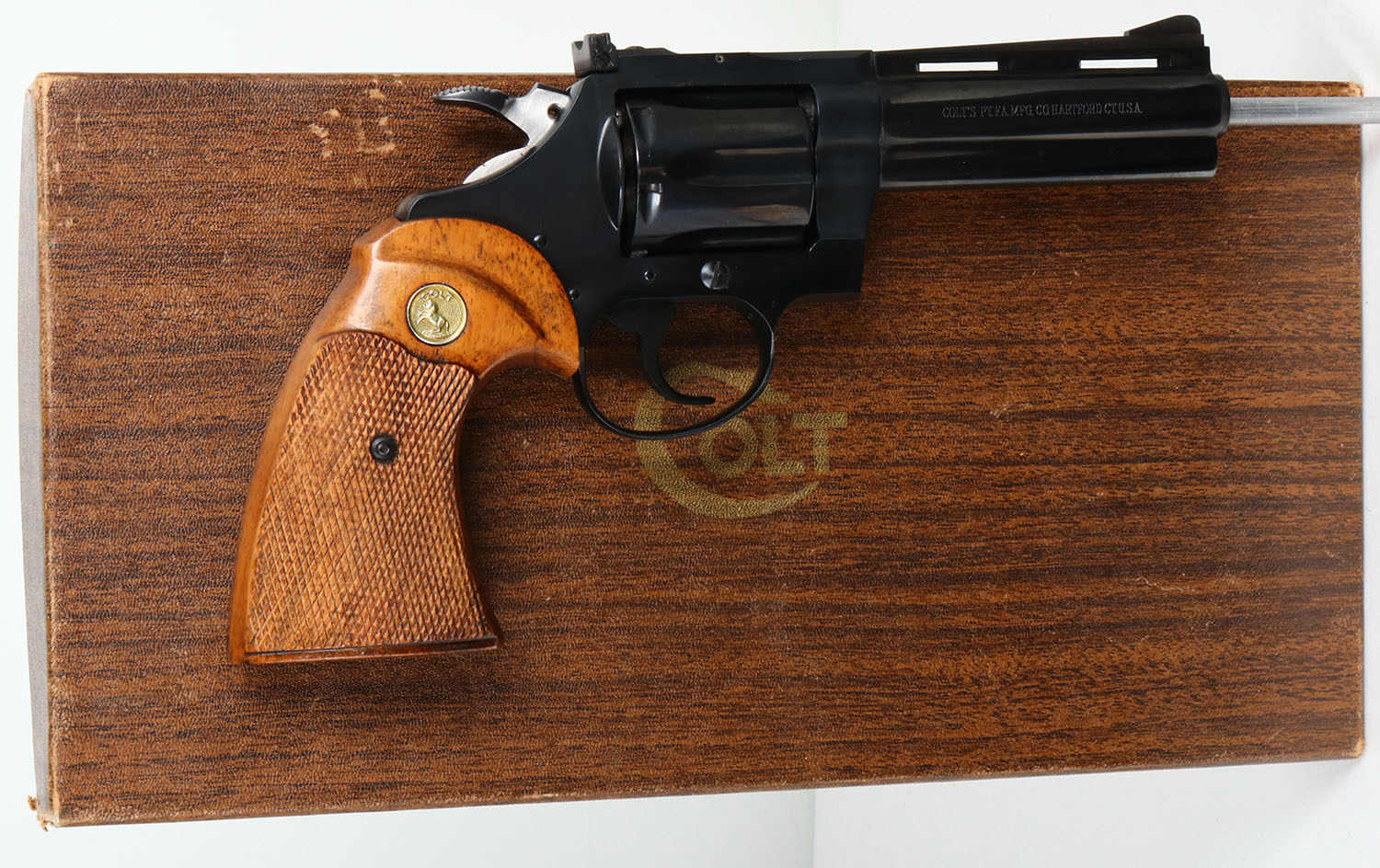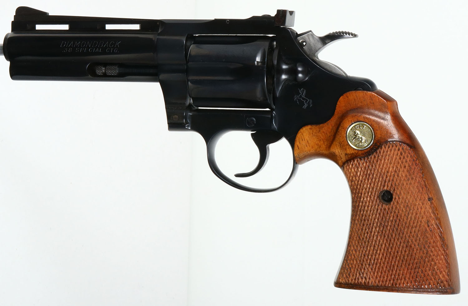 EARLY BOXED, Colt, Model Diamondback, CAL: .38 SPL, MFG: 1967, SN: D12419, Double Action Revolver, 4'' barrel. Early 2nd year production. The Colt Diamondback was introduced as a deluxe model in 1966, inspired by the successful Colt Python, in calibers of .22 LR, .22 WMR & .38 SPL. The Diamondback is built on the smaller ''D frame'', same as used in the Detective Special. It has a 6-shot swing-out cylinder & was available in blue or nickel finishes. It has a wide serrated target hammer, ventilated rib, fully adjustable target quality sights, & full-length barrel underlug. The left side of barrel is stamped ''DIAMONDBACK .38 SPECIAL CTG''. The Colt silver medallion, checkered walnut grips on this example are near mint. The high polish metal blued finish is likewise near mint. Bore is mint. The matte finished top of the ventilated rib barrel holds a screw height adjusting ''U'' notch rear sight & front blade sight. This gun comes in its original early production 2 piece Colt wood grain box, with purchase letter, warrenty card & other phamplet. Very desirable & scarce early model. FFL or C&R Req. - Value: 2000 to 2500