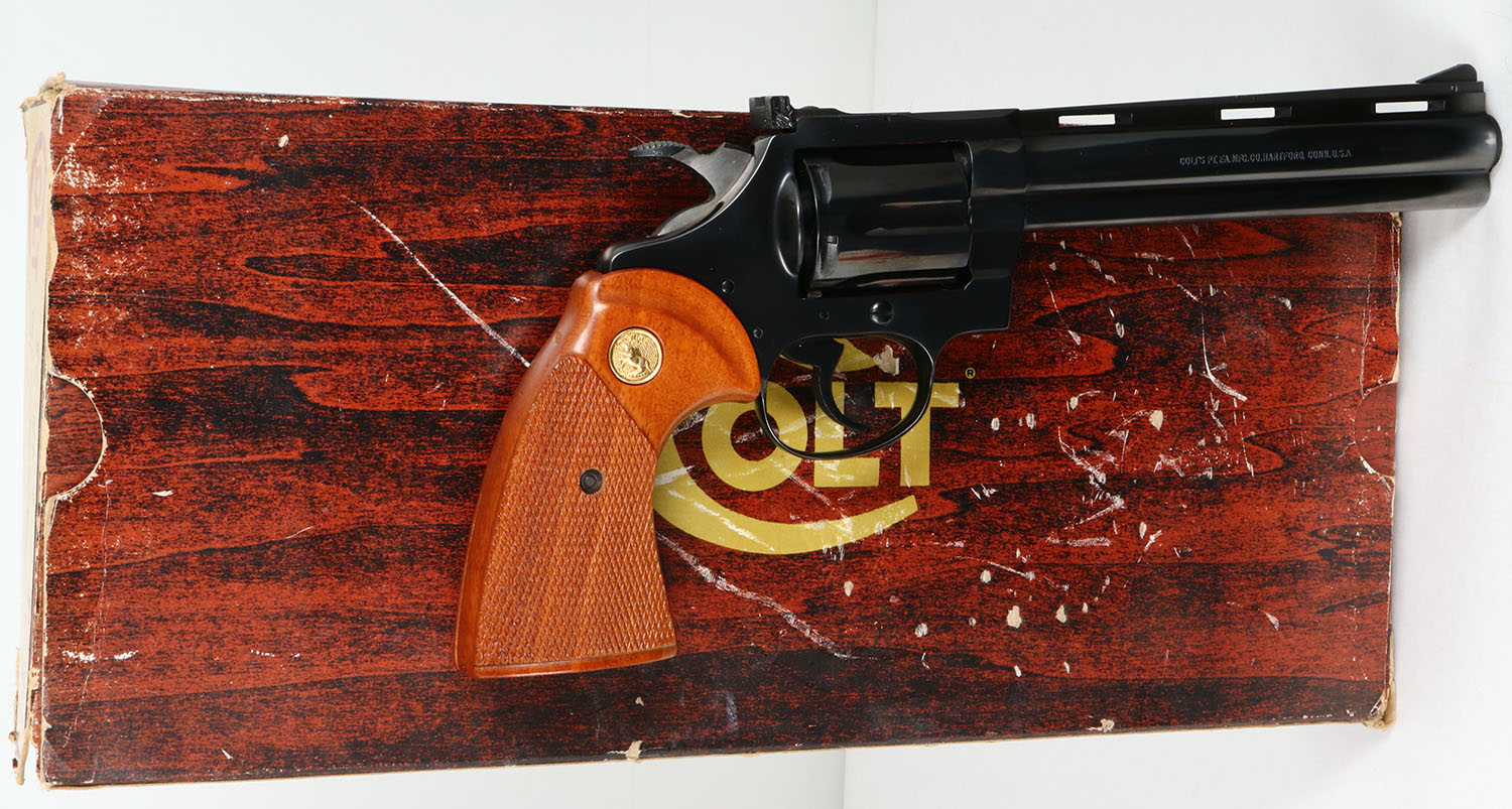 BOXED, Colt, Model Python, (D5560) CAL: .357 Magnum, MFG: 1975, SN: S78555, Double Action Revolver, 6'' barrel. The Colt Python was introduced as a premium model in 1955, in caliber .357 Magnum. The Python is built on the large I-frame & has a reputation for accuracy, smooth trigger pull, & a tight cylinder lock-up. It has a 6-shot swing-out cylinder & was available in Python blue, Royal blue, Python nickel & Python stainless steel finishes. Some firearm collectors & writers have described the Python as ''the finest production revolver ever made''. It has a wide serrated target hammer, ventilated rib, & fully adjustable target quality rear sights. The left side of barrel is stamped ''PYTHON 357 * .357 MAGNUM CTG * ''. The Rampant Colt gold medallion, checkered walnut grips on this example are mint. The high polish blued finish is near mint. Bore is mint. The satin finished top of the ventilated rib barrel holds a screw height adjusting ''U'' notch rear sight & front blade sight. This gun comes in its original Colt wood grain box, with instruction manuals. Basically NOS, & very collectible when found in this condition. FFL Req. - Value: 2500 to 3000