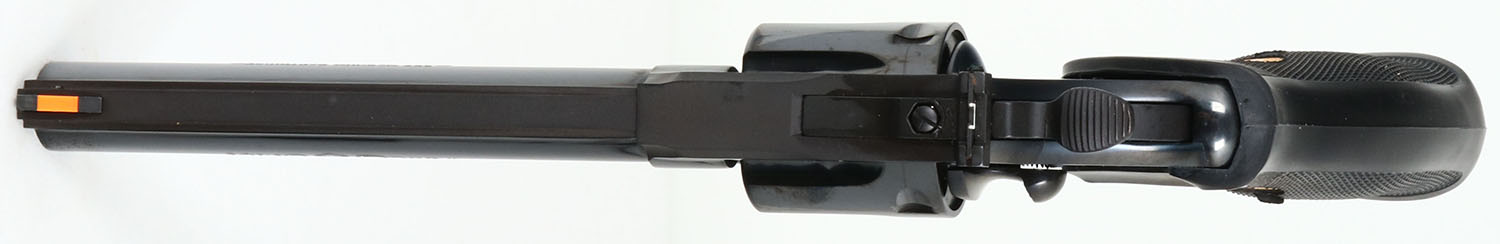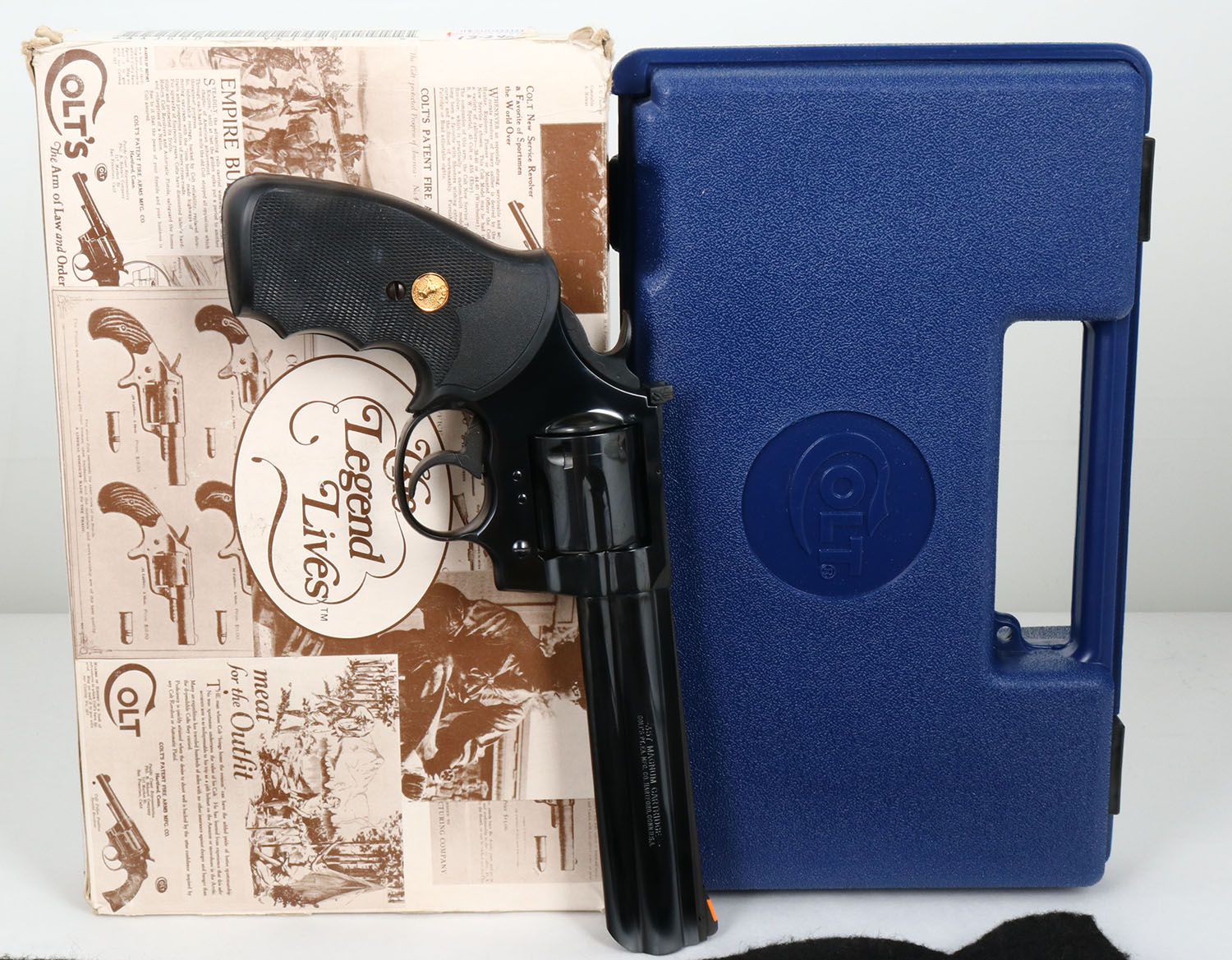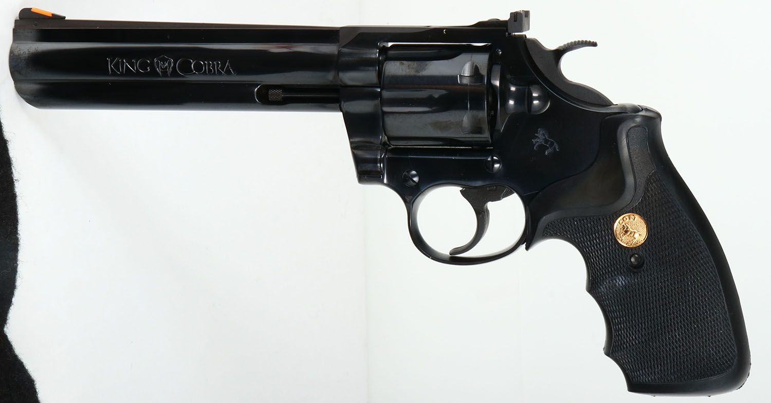 BOX & CASED, Colt, Model KING COBRA, (AA3660), CAL: 357 MAGNUM, MFG: 1992, SN:VK1234, Double Action Revolver, 6''' barrel. First introduced in 1986, the Colt King Cobra is a medium ''V'' frame double-action revolver made of very hi-grade carbon steel & featuring a six round cylinder. The bright blue finish of the initial offering in both 4'' & 6'' lengths were offered from 1986-1992. It was marketed to both aw enforcement agencies & civilian firearms enthusiasts. Two subsequent offerings of this model were later produced, however collectors gravitate to thees early production models, which subsequently demand a higher collector value. The left side of barrel is stamped ''KING COBRA''. The right side ''357 MAGNUM CARTRIDGE''. They came with Colt gold medallion Pachmayr black checkered rubber grips, with finger grooves. The grips on this example are excellent. The high polish blue finish is 100%, excellent. Bore is excellent. The solid rib barrel holds a screw height adjusting white ''U'' notch rear sight & front blade, with the serrated orang insert. This gun comes with original blue plastic case, in the original numbers matching outer sleeve box, with hang tag, packaging & instruction manual. Excellent overall & highly collectible. FFL Req. - - Value: 1500 to 2500