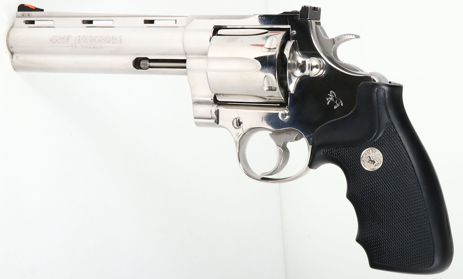 CASED, Colt, Anaconda, BTS, CAL: .44 Magnum, MFG: 1997, SN: MM95918, Double Action Revolver, 6'' barrel. The Colt Anaconda was introduced in 1990, in caliber 44 Mag & 45 Colt to compete in the popular large-bore Magnum pistol market. The Anaconda was built on the new & heavier large ''MM''-frame & was initially only produced in stainless steel as standard, with different Special order finishes available. The left side of barrel is stamped ''COLT ANACONDA -- 44 MAGNUM -- ''. The Colt marked textured rubber grips are excellent. The rare mirror high polish stainless (BTS) finish is excellent. Bore is minty. The frame holds a white outline ''U'' notch rear sight & front blade sight, with orange insert. This gun comes in an original Colt blue plastic case, with instruction manual. FFL Req. - Value: 2000 to 3000