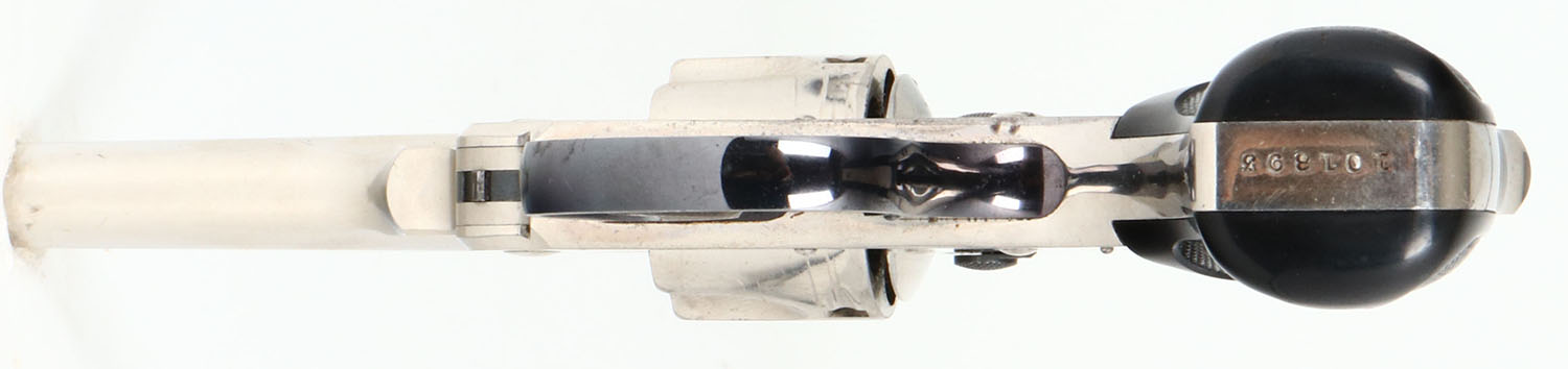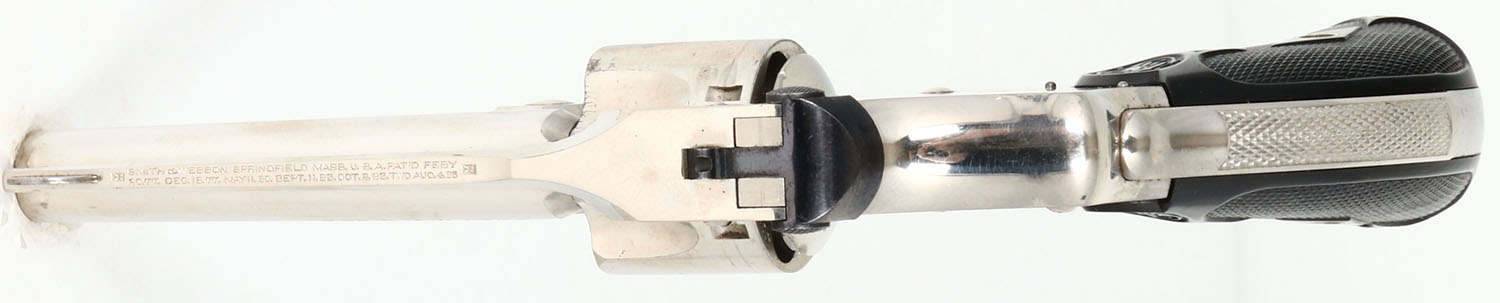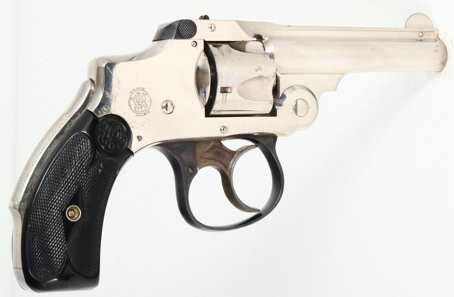 Smith & Wesson, Safety Hammerless, 2nd Model ''Lemon Squeezer'', CAL: 32 S&W, MFG:1902-09. SN: 101893, Double Action Revolver, 3' barrel. The S&W logo checkered hard rubber grips are excellent. The nickel finish is excellent, retaining full coverage, with some thin brush lines & light speckling. The trigger guard is blued & trigger is case-hardened. Bore is very good & bright, but with some spotty areas of light roughness. The barrel holds a pinned blade front sight & an adjustable small notch rear sight. A very nice example of a lemon squeezer. FFL or C&R Req. - Value: 300 to 600