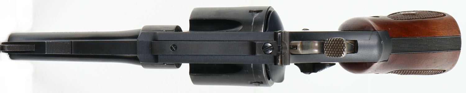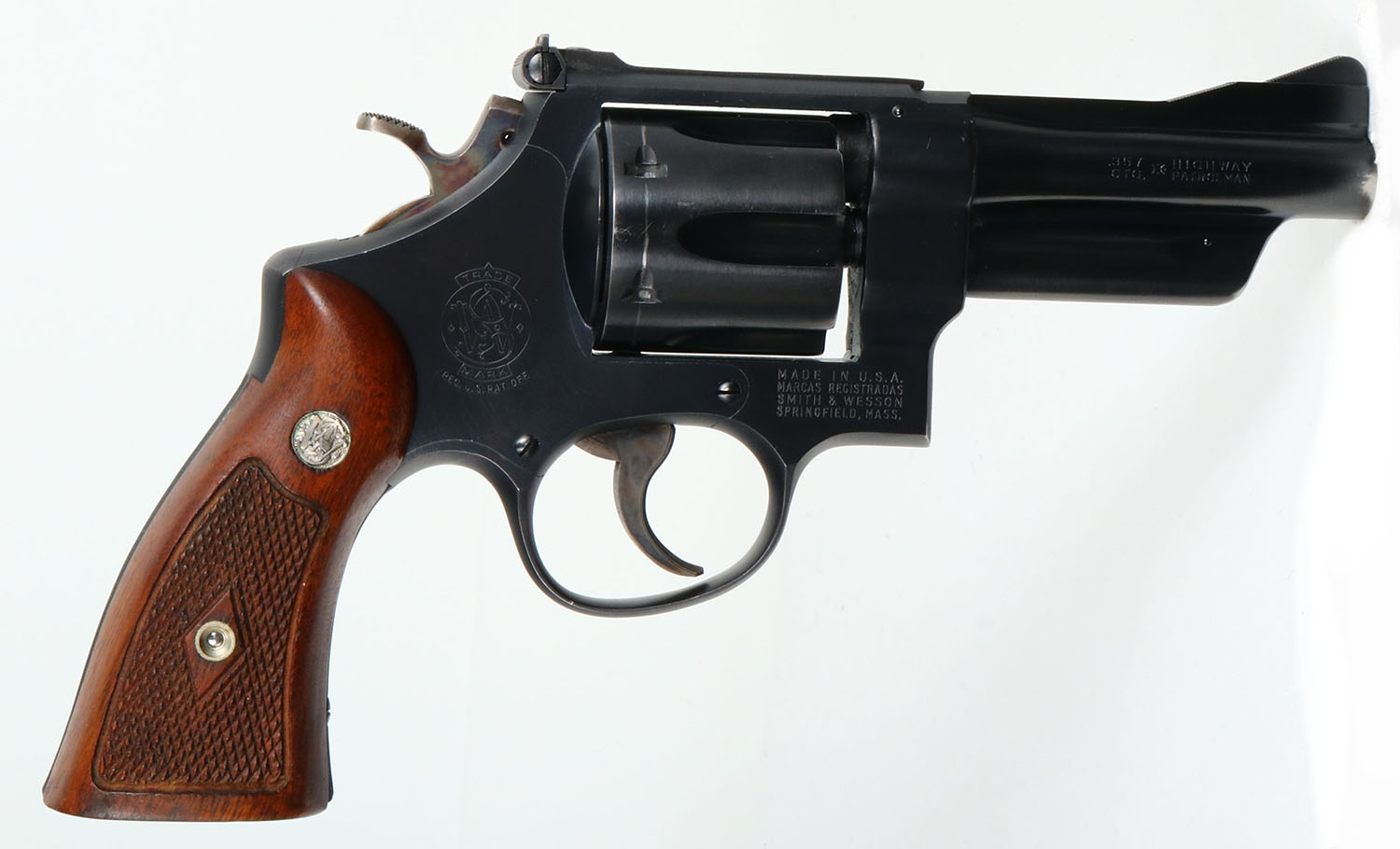 Smith & Wesson, Model 28 Highway Patrolman, 4 Screw, CAL: 357 MAG, MFG: 1961, SN: S214831, Double Action Revolver, 4'' barrel. The left side of the barrel is marked ''SMITH & WESSON''. The right side of the frame is marked with the S&W trademark logo & the standard four line address stamp. The right side of the barrel is marked ''357CTG * HIGHWAY PATROLMAN''. The S&W logo silver medallion & checkered diamond grips are excellent. The metal blue finish rates 99%, with a faint drag line on the cylinder. The trigger & hammer are case-hardened, retaining full case-colors. Bore is excellent. The frame holds an adjustable rear sight & ramp elevated blade front sight. A very high condition & desireable Model 28. FFL or C&R Req. - Value: 1000 to 1600