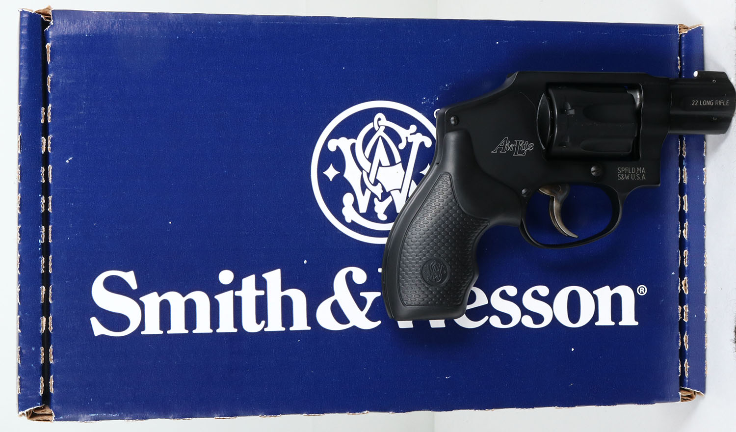 NEW, BOXED, Smith & Wesson, Model 351C Air-Lite, CAL: 22MAG (marked 22LR on barrel), MFG: Modern, SN: DYP5650, Double Action Revolver, 2'' barrel. This revolver is a rare factory production error. The barrel carries the incorrect caliber of .22 LR, yet this model was manufactured only in .22 MAG & is of course a .22 MAG. This is likely to become a unique collectable as a result. The S&W logo textured hard rubber grips are excellent. The matte black finish rates 99%+. Bore is excellent. The frame has an integrated groove & the barrel has a white dot front sight. Comes in factory box, with lock & paperwork. NIB.* FFL Req. - Value: 600 to 800