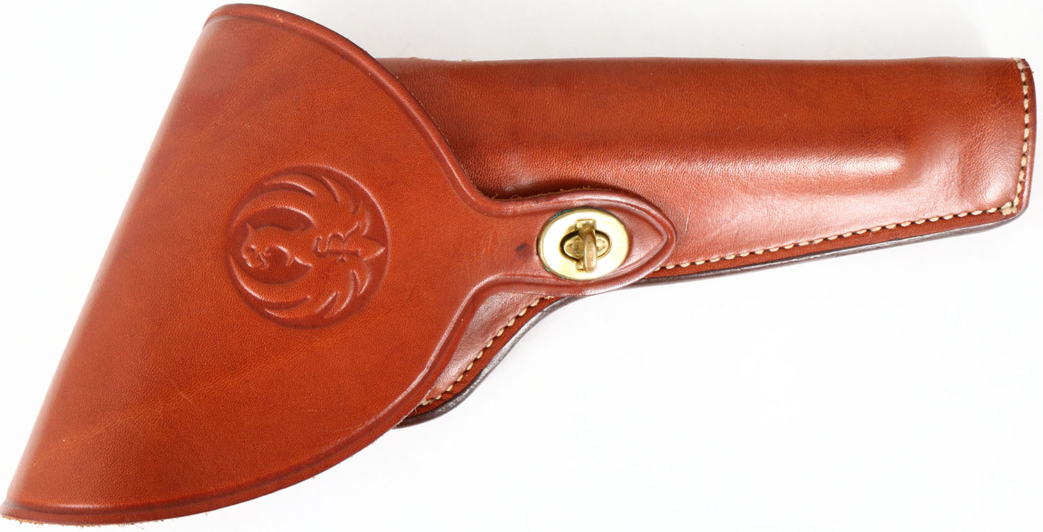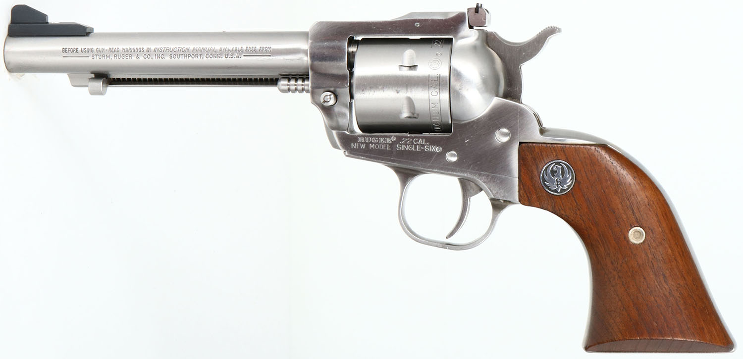 BOXED, Ruger, New Model Single Six, CAL: 22MAG/22LR, MFG: 1982, SN: 68-32687, Single Action Revolver, 5 1/2'' barrel. The Ruger logo medallion wood grips are excellent, with light handling scuffs. The stainless steel finish is excellent, with minor handling marks. Bore is excellent & bright. The frame holds an adjustable rear sight & elevated blade front sight. Comes in original box, with owners manual, extra cylinder, & a Ruger logo 5 1/2'' Super Single Six leather holster. FFL Req. - Value: 600 to 1000
