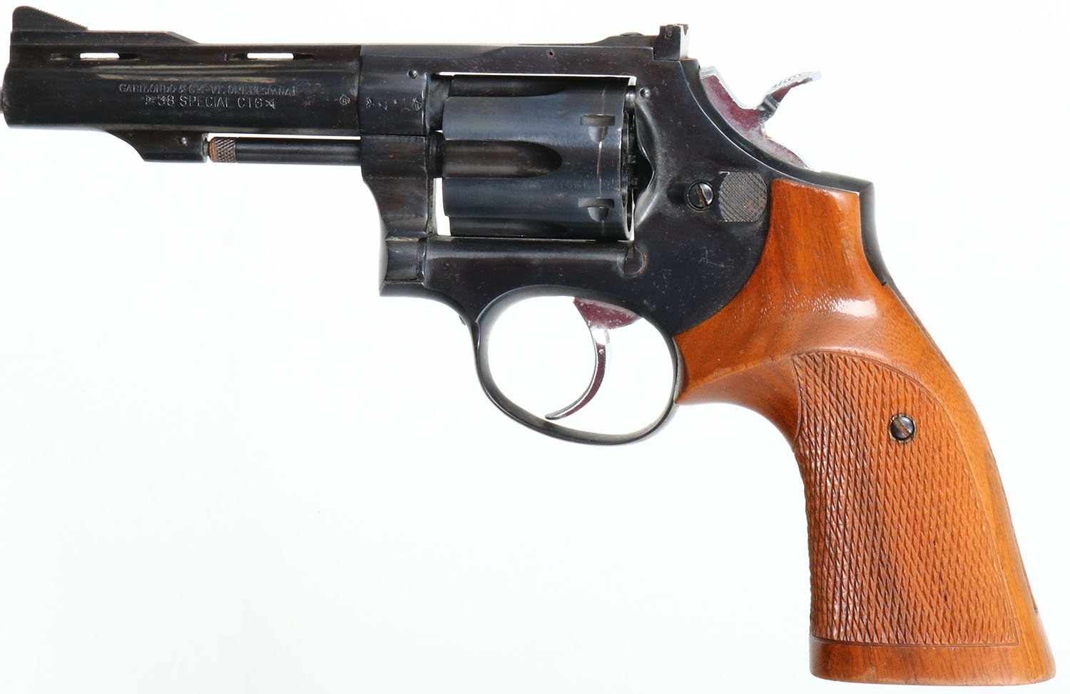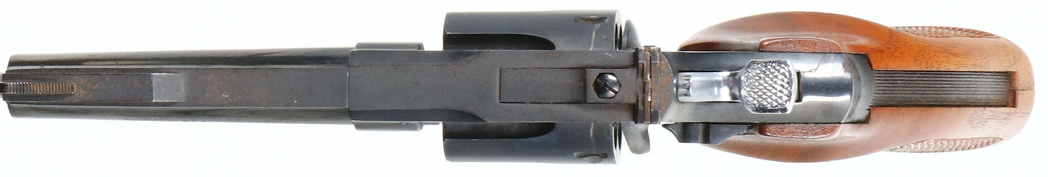 LLAMA, Model Martial, CAL: 38 Special, MFG: 1959-70, SN: 724795, Double Action Revolver, 4 '' barrel. The checked wood grips are excellent. The metal blue finish rates 90% overall. Bore is very good. The frame holds an adjustable rear sight & the barrel holds an elevated serrated blade front sight. Nickeled hammer & trigger. FFL or C&R Req. - Value: 300 to 500