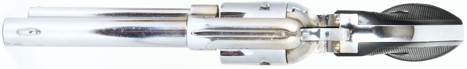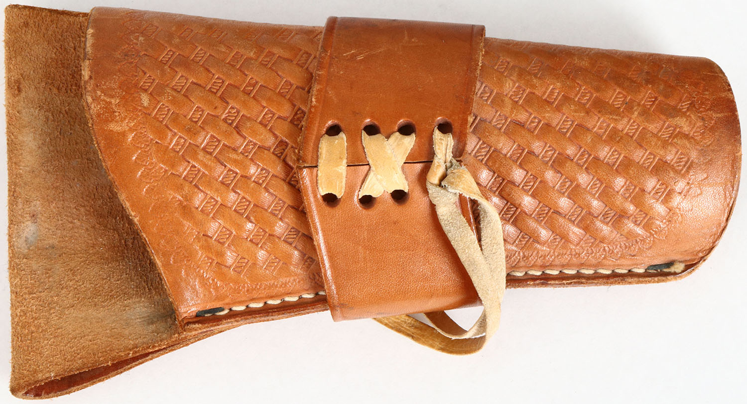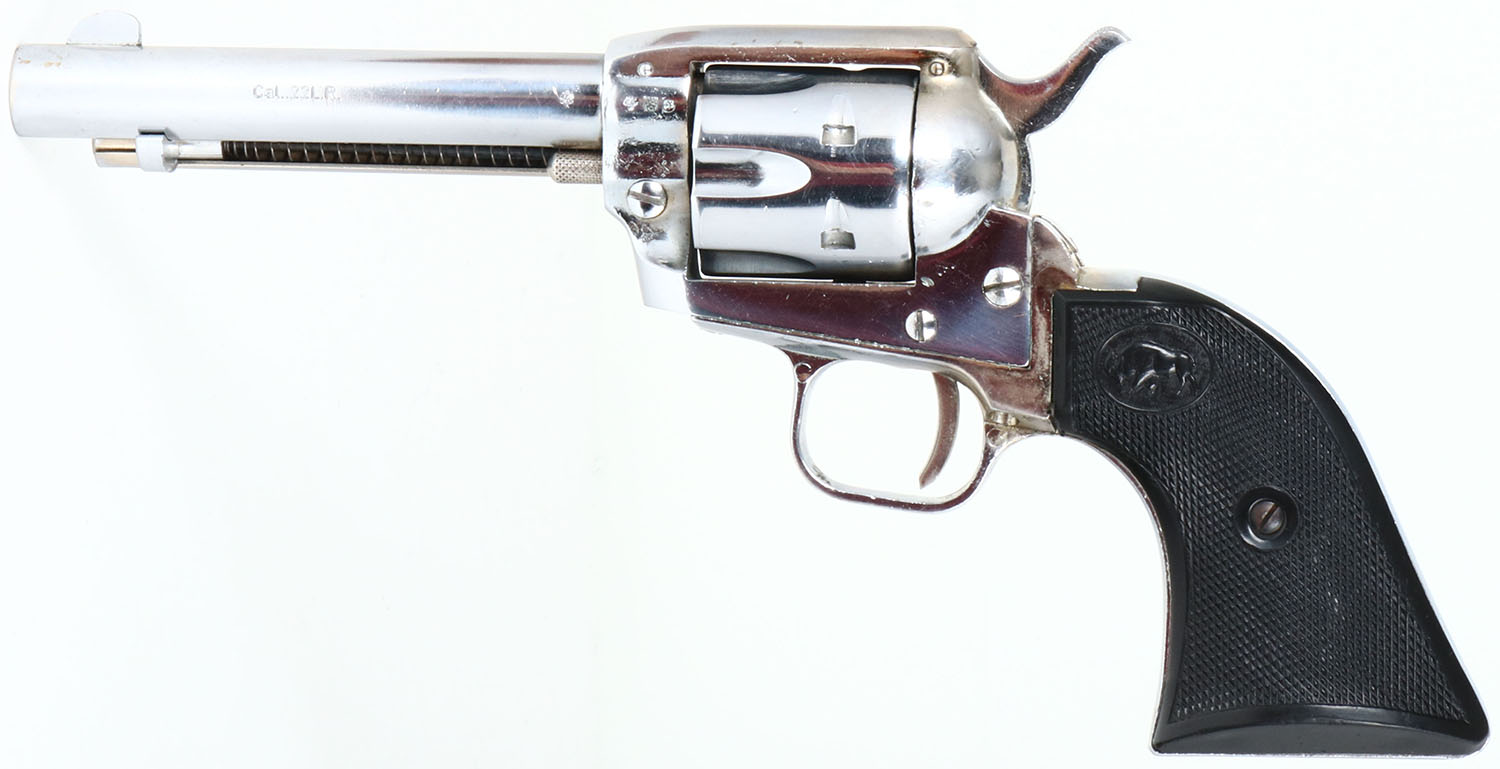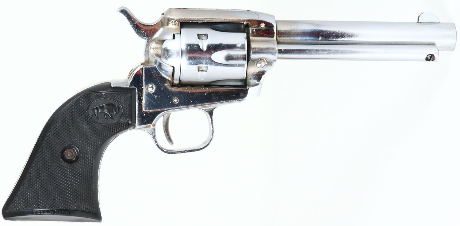 German Made, Model ''Texas Scout'', CAL: 22LR, MFG: Modern, SN: 74099, Single Action Revolver, 4 3/4'' barrel. The Buffalo logo checkered plastic grips are excellent, with minor handling marks. The nickel finish is very good & full. Bore is excellent. Notch & blade sights. Comes with a weave pattern leather holster. FFL Req. - Value: 200 to 300
