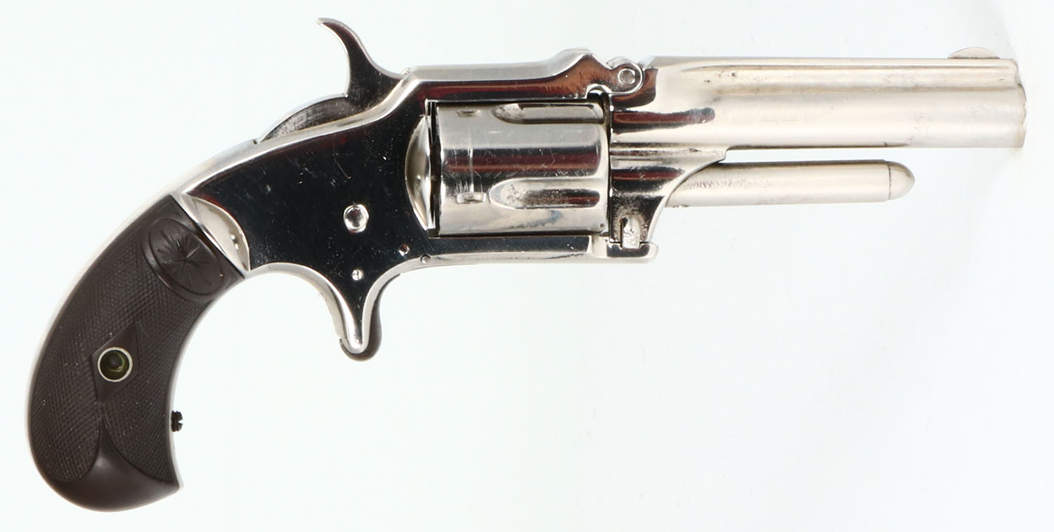 J.M Marlin, No.32 Standard 1875 Pocket Revolver, CAL: 32, MFG: 1875-87, SN: 3378, Tip-Up Single Action Revolver, 3'' barrel. The checkered brown hard rubber star grips are excellent. The original nickel finish is excellent, with some minor intermittent spotting. Bore is excellent, with light pitting near the muzzle. The frame has an integrated groove & the barrel holds a small half moon front sight. Antique, No FFL Req. - Value: 200 to 400
