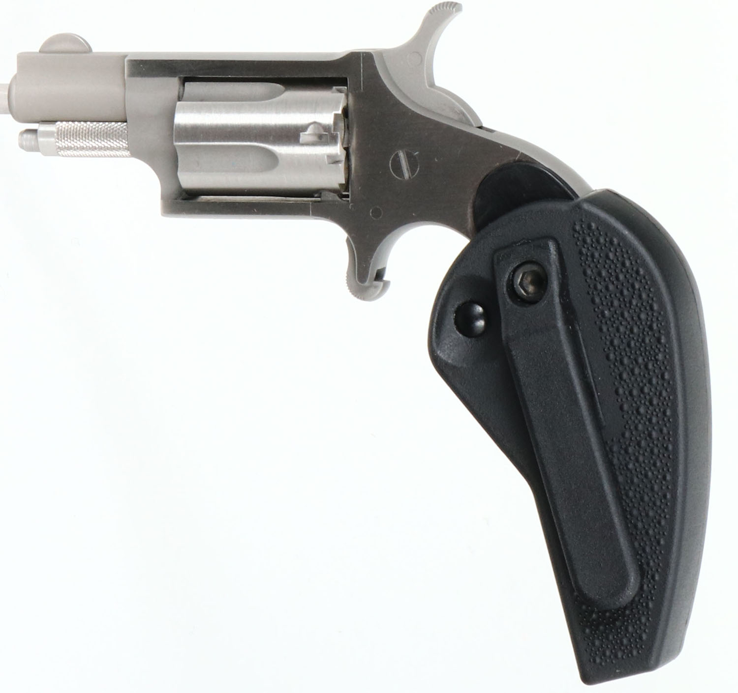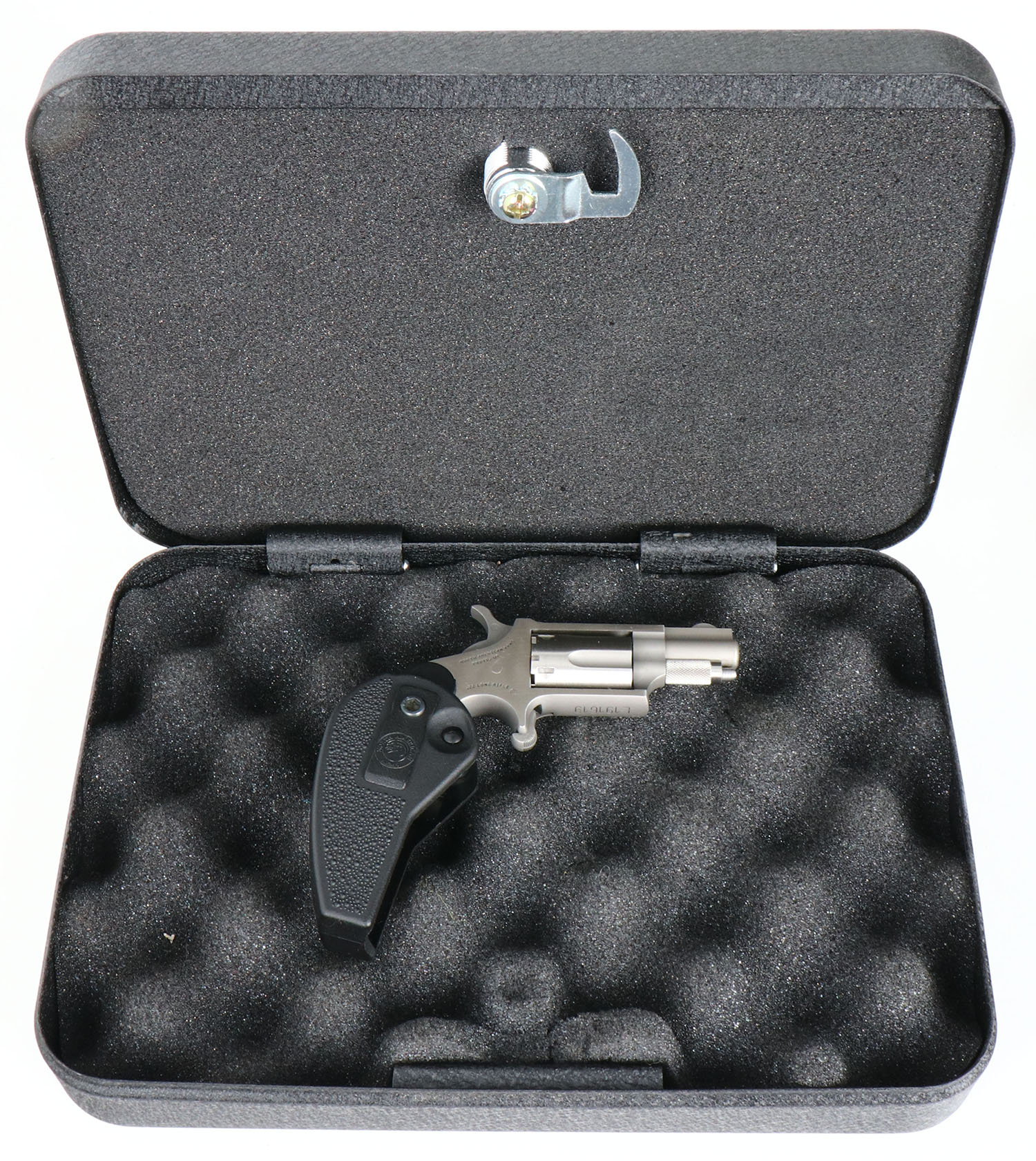 CASED, North American Arms, Model NAA-22LR-HG, CAL: 22LR, MFG: Modern, SN: L191619, Single Action Revolver, 1'' barrel. The folding & textured belt clip grip is excellent. The stainless steel finish is excellent. Bore is excellent. The barrel holds a small half moon blade front sight. Comes in a NAA metal hard case, with keys. FFL Req. - Value: 200 to 300
