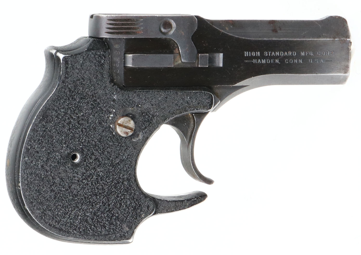 High-Standard, Derringer ''Model D-101'', CAL 22, MFG: 1975, SN: D06288, Top Break Double Barrel Pistol, 3 1/2'' barrels. There are no grips currently on this pistol. The metal blue finish rates 85% overall, with speckling & areas worn to metal grey. The frame Bores are excellent & bright. Standard notch & blade sights. Barrel housing has a little bit of play. FFL or C&R Req. - Value: 150 to 350