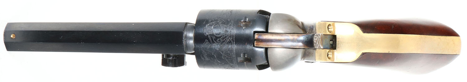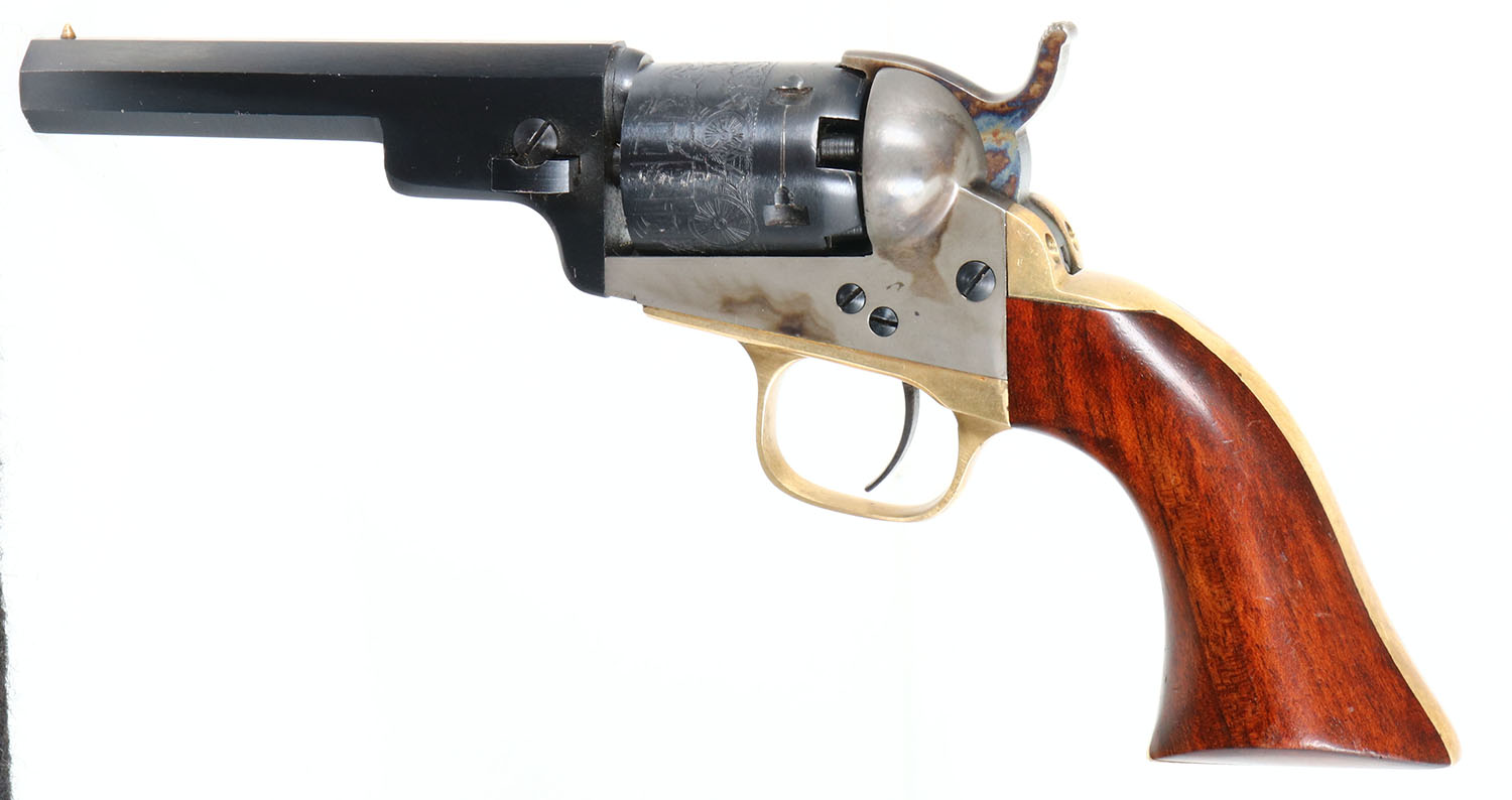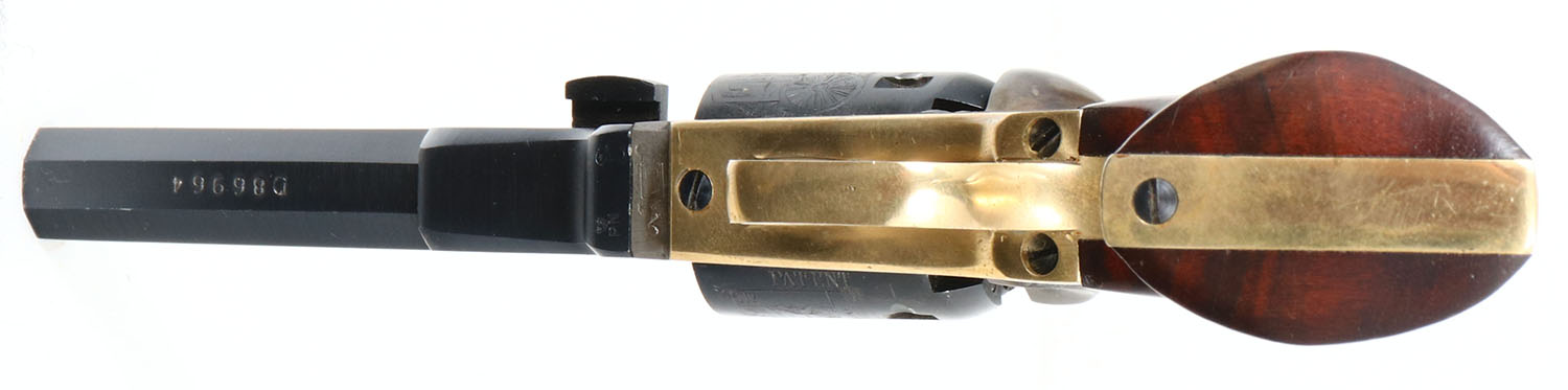 ASM, 1849 Pocket Replica, CAL: 31, MFG: Modern, SN: D86964, Single Action Black Powder Revolver, 4'' barrel. The wood grips are excellent, with minor handling marks. The cylinder displays a stagecaoch scence. The metal blue finish on the barrel & cylinder rates 98%. The frame & hammer are case-hardened. The frame has worn to metal grey, with cas-color shadows remaining & the hammer still has vivid case colors. The trigger guard & backstrap are polished brass. Bore is excellent. The barrel holds a small inverted cone front sight. Black Powder, No FFL Req. - Value: 150 to 350