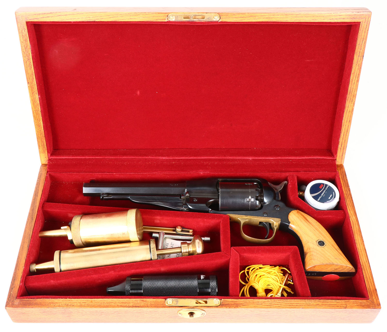 CASED, Navy Arms, Model 1858 Remington Replica, CAL: 36, MFG: Modern, SN: 2381, Black Powder Percussion Revolver, 6 1/2'' barrel. The wood grips are excellent, with handling marks & scuffs. The metal blue finish rates 98% overall. The trigger guard is brass, with an aged patina. The hammer is case-hardened, retaining visible, but slighty faded case-colors. Bore is excellent. Groove & blade sights. Comes in custom wood case, with red interior. Inlcuded in the case is a brass grease tube, brass powder tube, brass percussion cap dispenser, Cabela's marked black wad tube (full of wads), tool, CCI percussion caps, balls & extra nipples. A complete black powder set. Black Powder, No FFL Req. - Value: 200 to 400