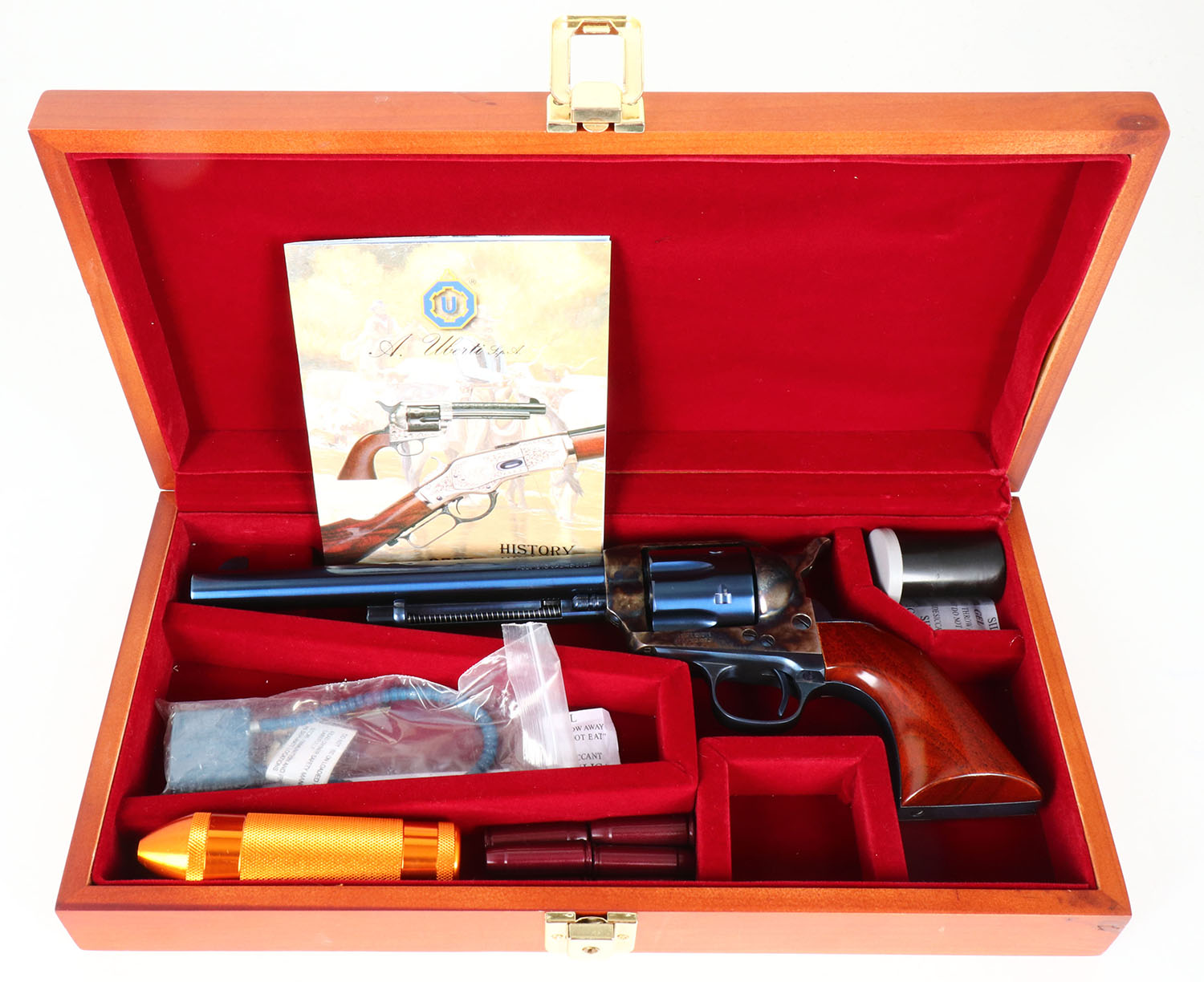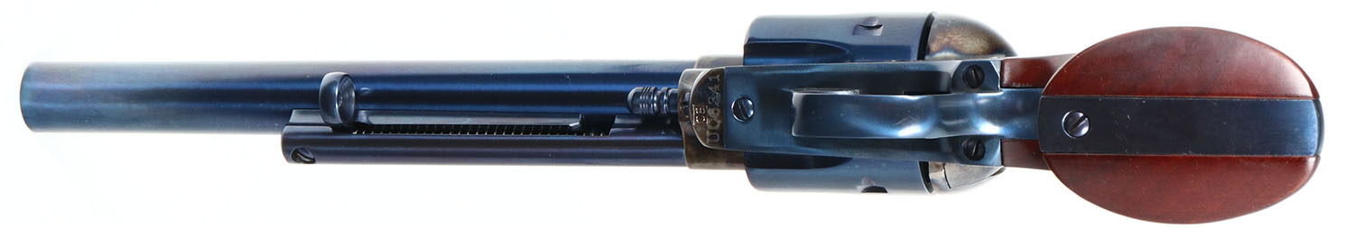 CASED, A. Uberti, Model 1873 Cattleman, CAL: 45 COLT, MFG: Modern, SN: UC6341, Single Action Revolver, 7 1/2'' barrel. The wood grips are excellent. The charcoal-blue metal finish on the barrel, cylinder & trigger guard is excellent, rating 99%+. The frame & hammer are case-hardened, retaining full case-colors. Bore is excellent. Groove & blade sights. Comes in a custom wood case, with red interior. Included in the case is paperwork, a cleaning kit in a orange metal container, (6) snap caps, lock/key & case keys. FFL Req. - Value: 700 to 1000