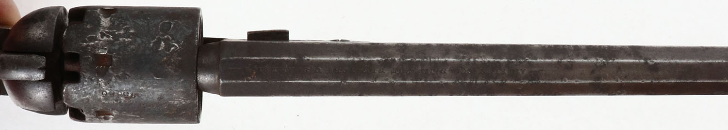 Colt, Model 1851 Navy, CAL: 36, MFG: 1863, SN: 148561, Single Action Percussion Revolver, 7 1/2'' barrel. Historical as a Native American owned Colt, with fantastic leather sheath, displaying wonderful & authentic native beaded work. The top of the barrel is marked ''--ADDRESS SAM L COLT NEW YORK U.S. AMERICA--''. The left side of the frame is marked ''COLT'S PATENT''. The cylinder is marked with a 'M'', with the naval engagement long since worn away. The full matching SN is displayed on the barrel, frame, trigger guard & butt. The original wood grips are very good & solid, some remains of original finish with light scrapes & minor edge nicks & dings. The metal has fully toned to a brown patina, with rust pitting. The trigger guard & backstrap are brass. Bore is good, with pitting amongst proud rifling. The barrel front dovetail is open & the hammer (when cocked) has an integrated groove acting as a rear sight. The metal surfaces display lots of abrasions, contusions & nicks consistent with old west, frontier & Native American use & ownershjp. The revolver needs a good cleaning & oiling, but also likely needs some gunsmith work to restore functionality. Hammer & trigger do not function correctly. Some parts many need repair or replacing. Nicely displayed in a wood & glass display case. Antique, No FFL Req. - Value: 1000 to 4000
