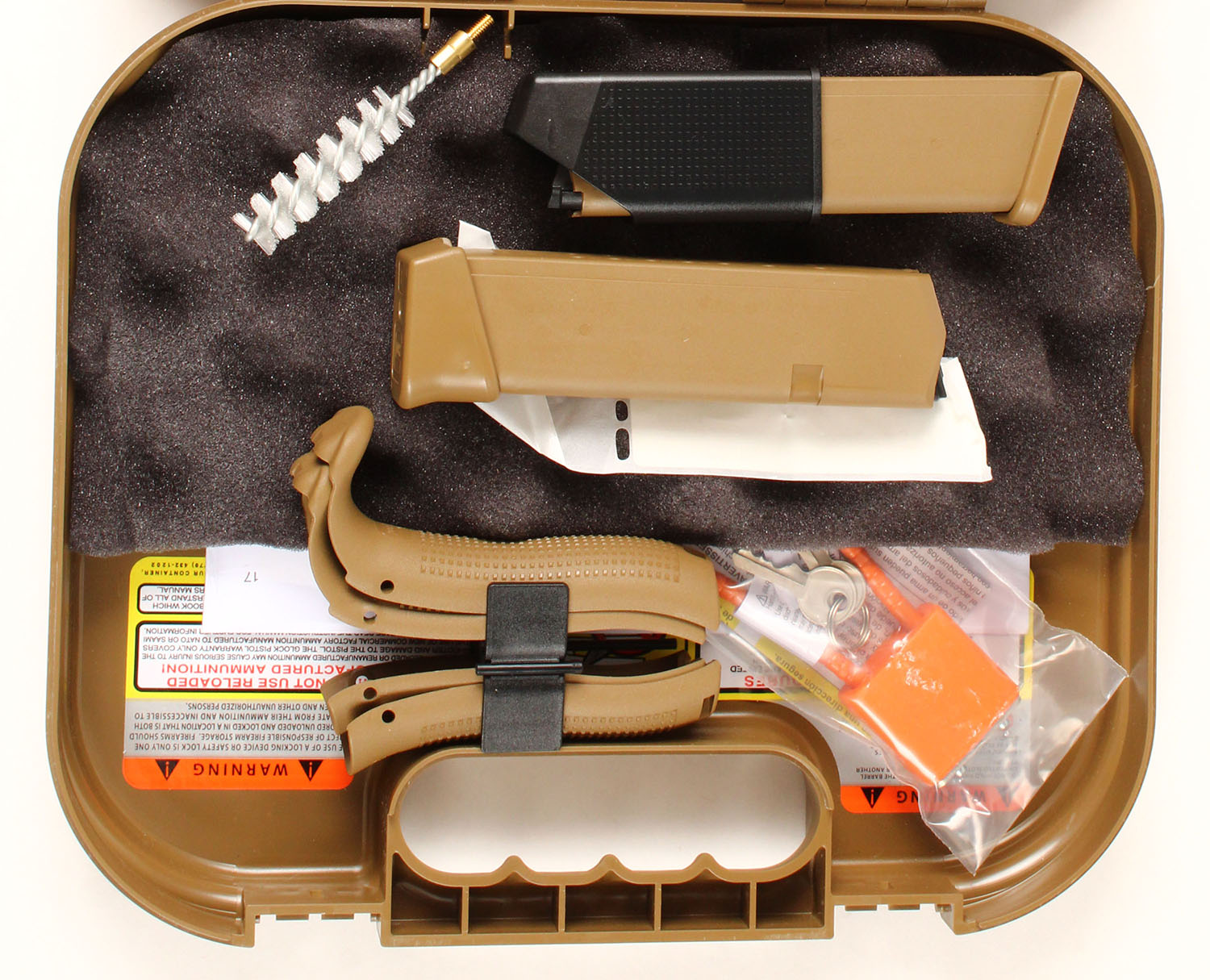NEW CASED, Glock, Model 19X GEN 5, CAL: 9mm (9x19), MFG: Modern, Semi-Auto Pistol, 4'' barrel. The polymer frame & grips are mint. The Coyote nPVD coated slide is mint. Bore is mint. Factory rear two dot night sight & front dot night sight. Comes in the original factory case with owners manual, lock/key, cleaning rod/brush, grip attachments, (3) 17rd mags & speed loader. NOS. FFL Req. - Value: 600 to 750