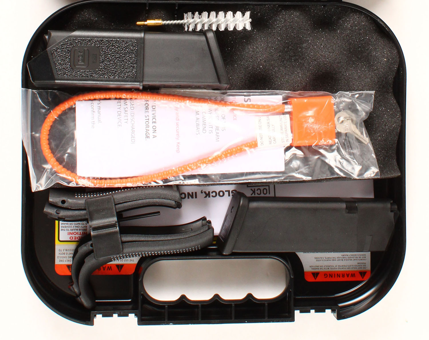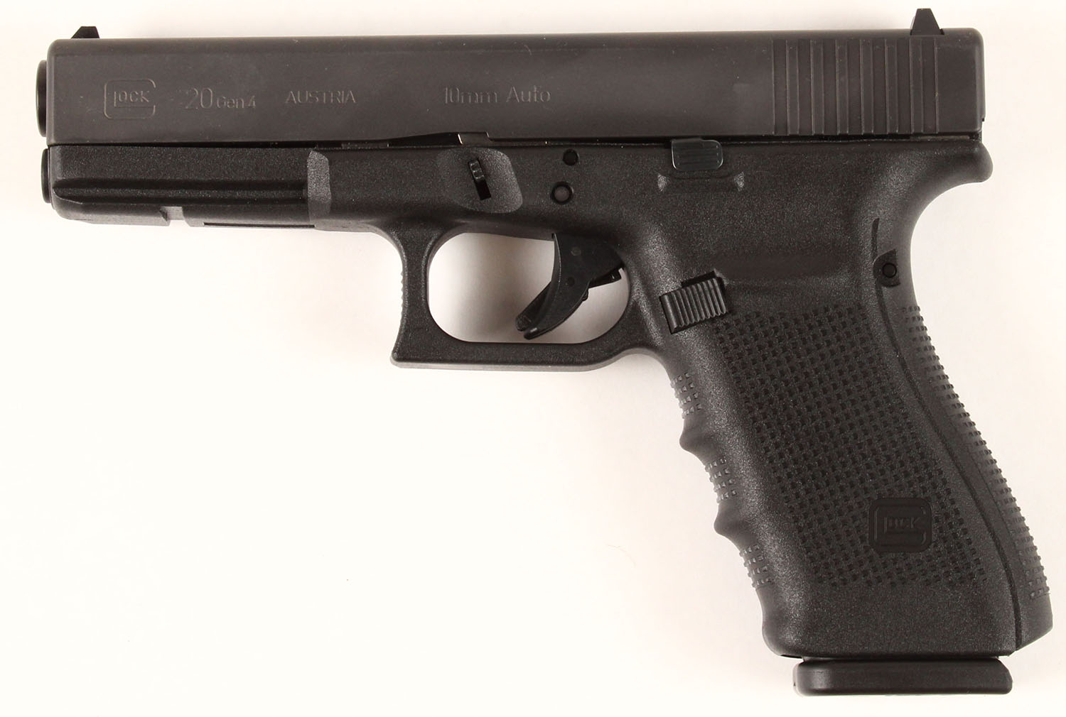 NEW CASED, Glock, Model 20 Gen 4, CAL: 10mm, MFG: Modern, Semi Auto Pistol, 4 1/2'' barrel. The textured polymer grip & frame are mint. The factory matte black finish is mint. Bore is mint. Factory square notch rear sight & white dot front sight. Comes in factory hard case, with owners manual, lock/key, cleaning rod/brush, grip attatchments, (3) 15rd mags & speed loader. NOS. FFL Req. - Value: 500 to 700